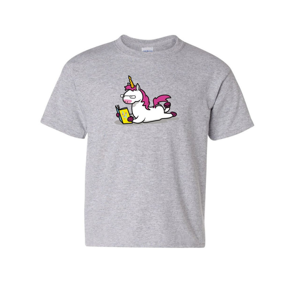 UNICORN BOOKWORM youth t-shirt funny college student nerd geek study kids tee gray