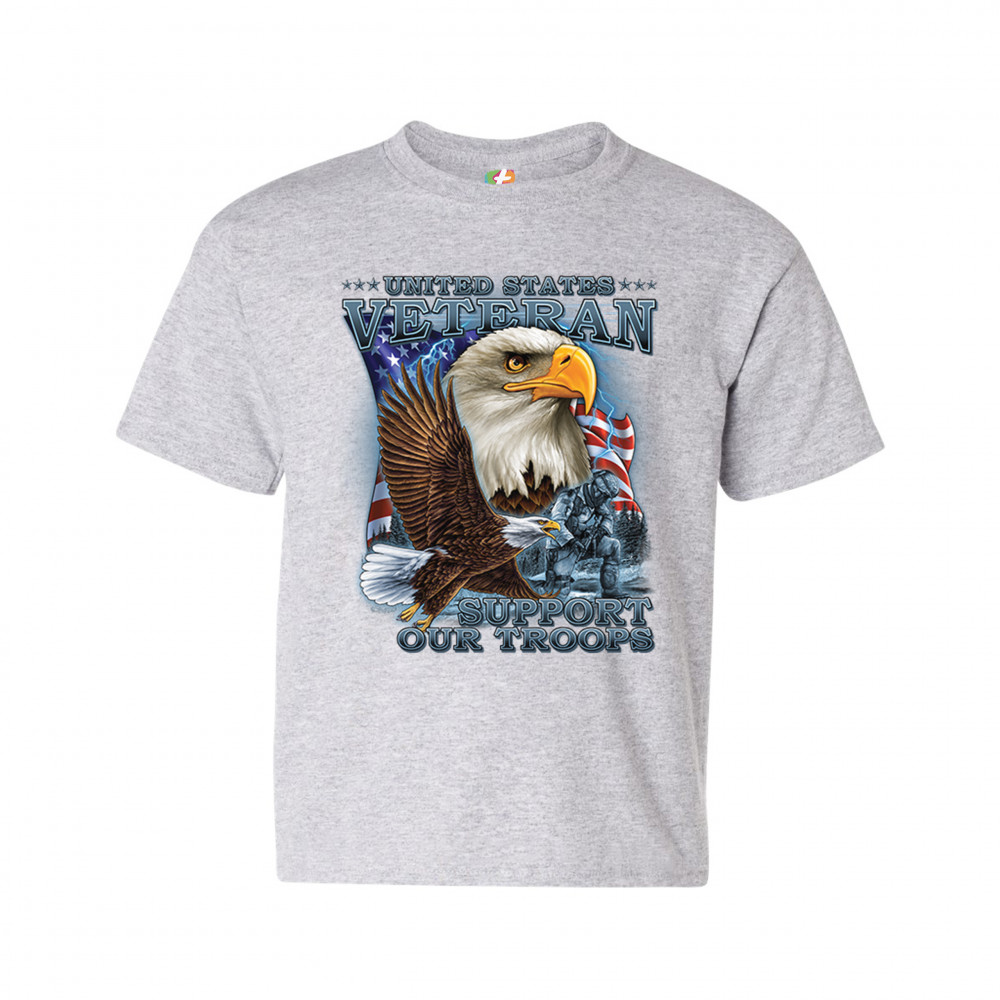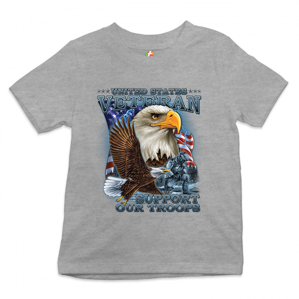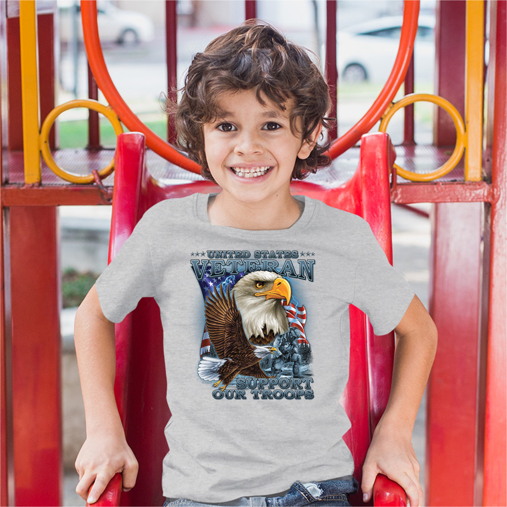 A patriotic print featuring a flying American bald eagle. There is another bald eagle covering most of the American flag in the background. There is a kneeling soldier in the front. The print says: "United States Veteran, Support our Troops". A great choice for a true patriot of the USA