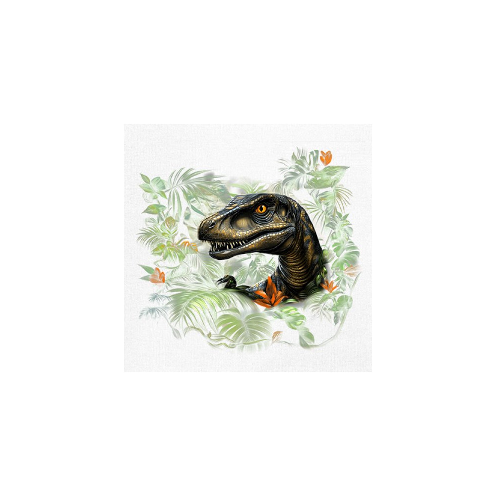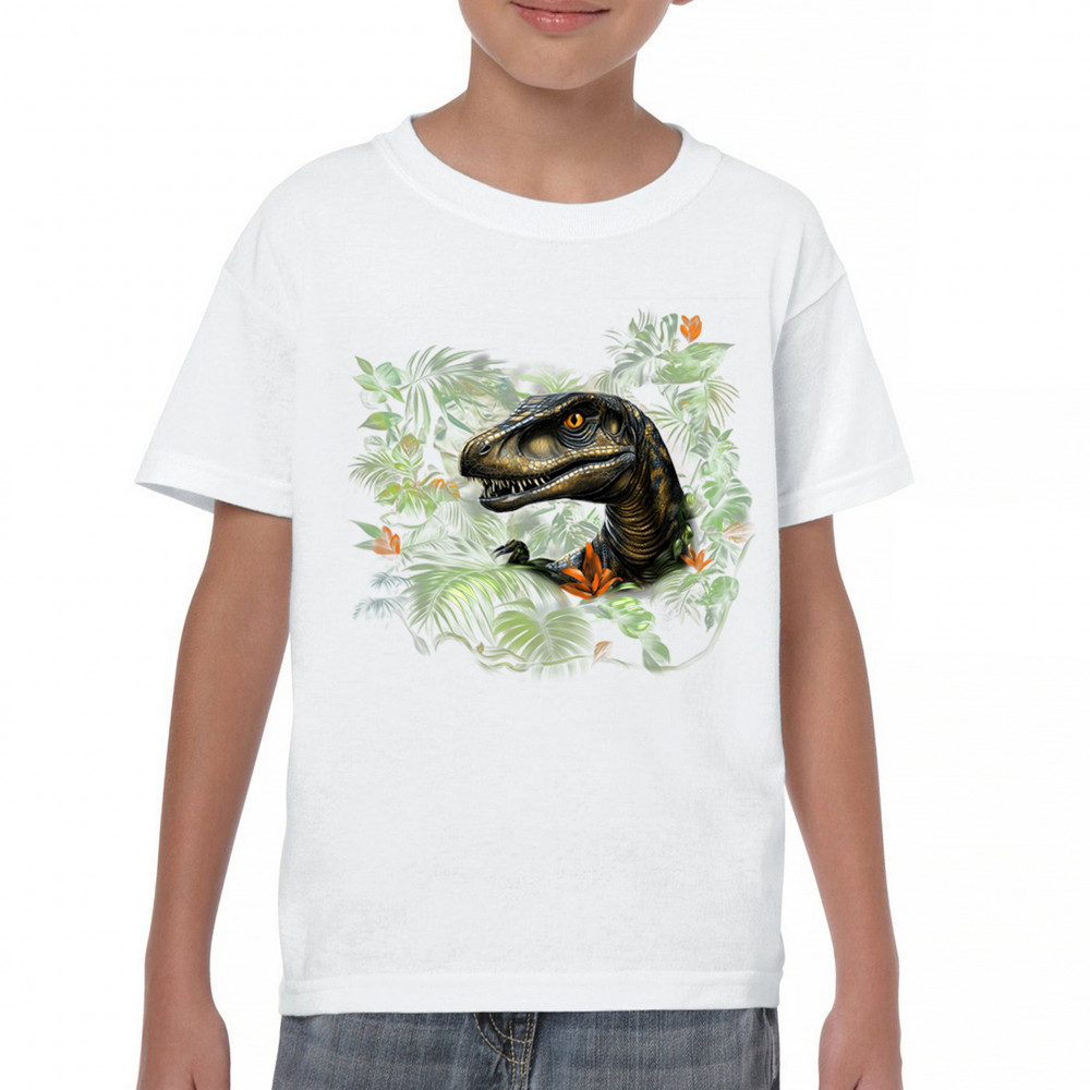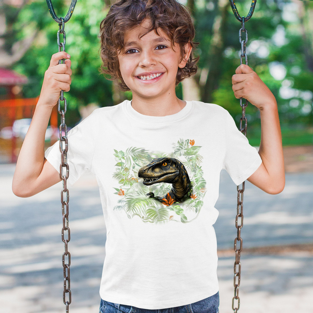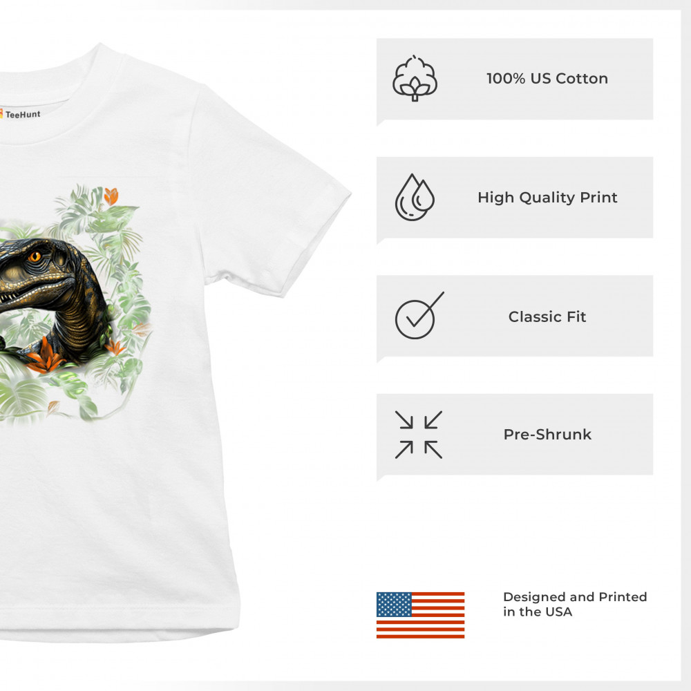Step into the wild with this striking jungle raptor design. A highly detailed velociraptor peeks from vivid tropical foliage and flowers, perfect for dinosaur lovers, fossil fans, and ancient creature enthusiasts. Whether for Jurassic adventures, museum trips, or themed events, this design unleashes untamed prehistoric energy.