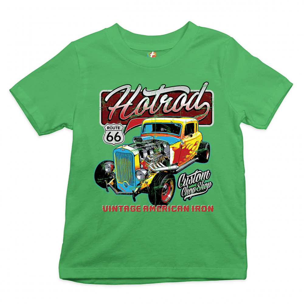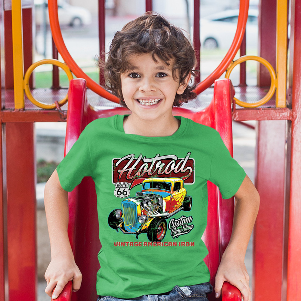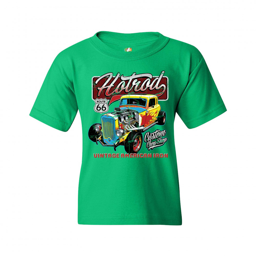 VINTAGE AMERICAN IRON youth t-shirt hot rod route 66 retro racing kids green