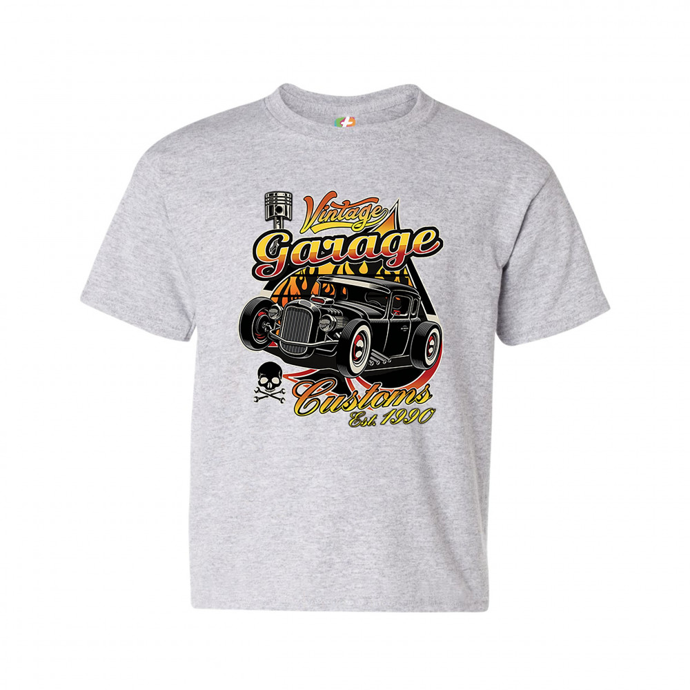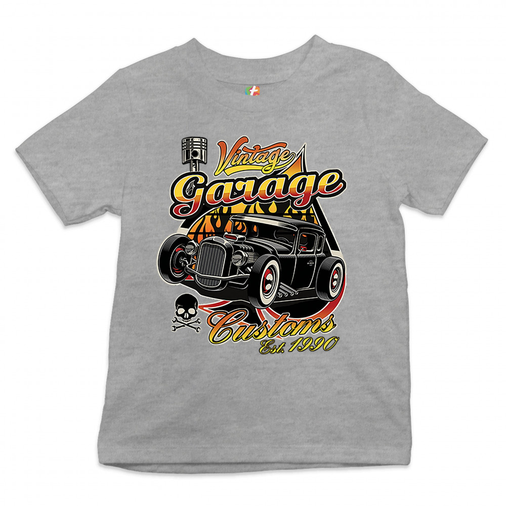 A print featuring a lowrider hot rod, a small skull with crossed wrenches instead of bones, a piston and an ace of spades in the background. The orint says: "Vintage Garage Customs Est. 1990". A great choice for a fan of customized American classic cars a