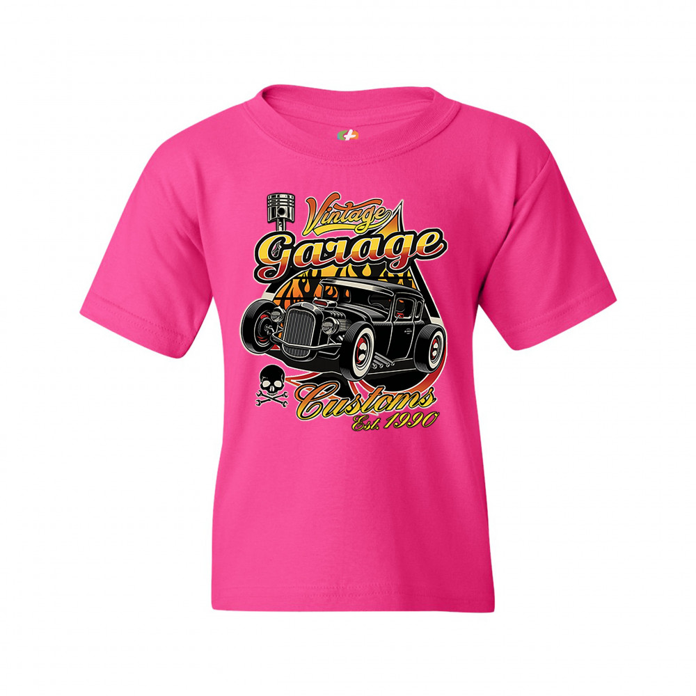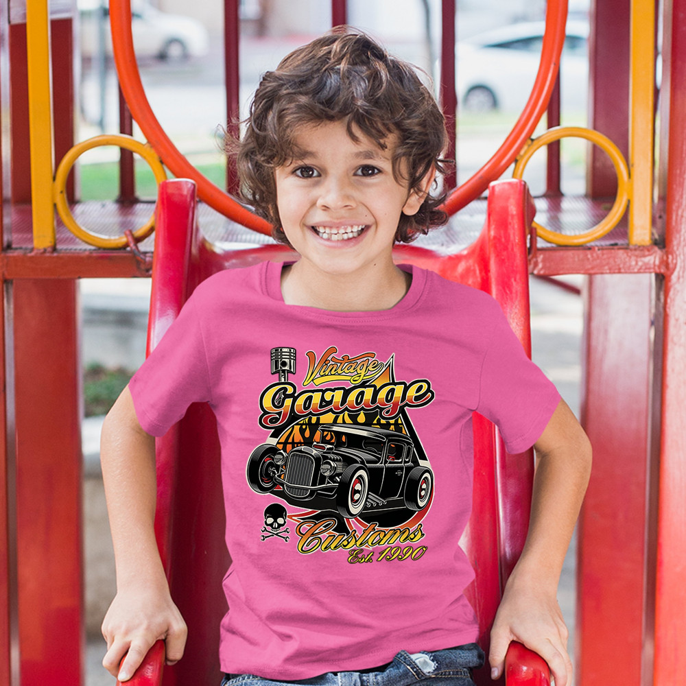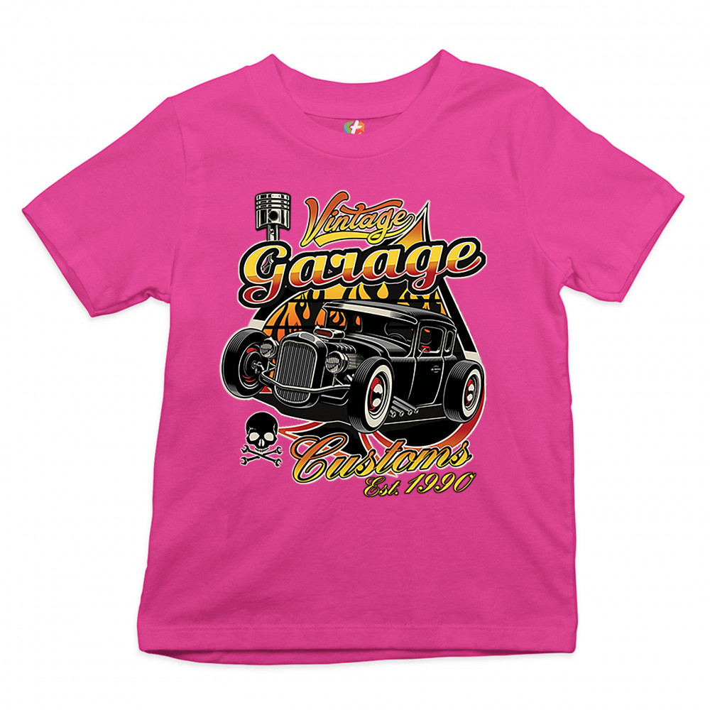A print featuring a lowrider hot rod, a small skull with crossed wrenches instead of bones, a piston and an ace of spades in the background. The orint says: "Vintage Garage Customs Est. 1990". A great choice for a fan of customized American classic cars a