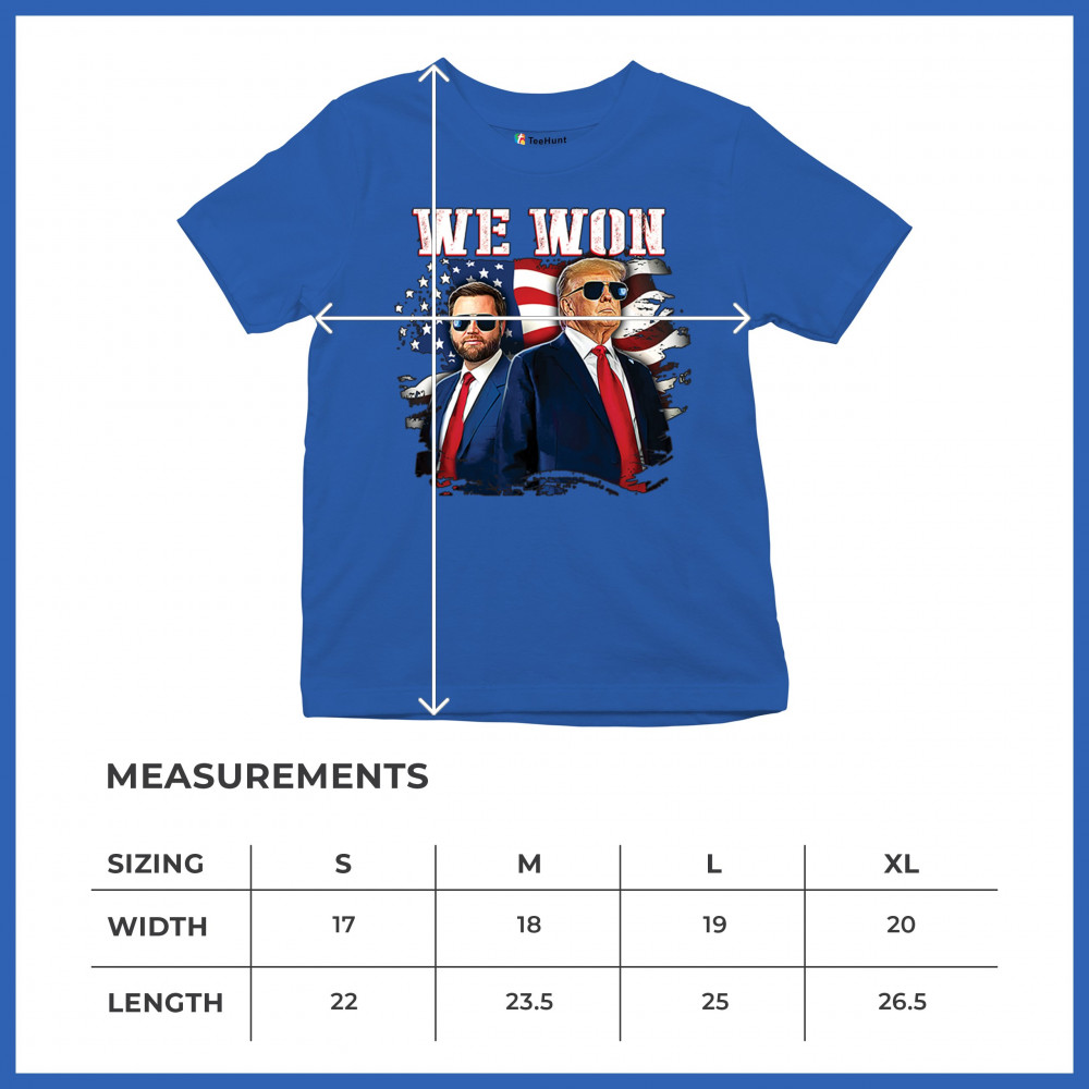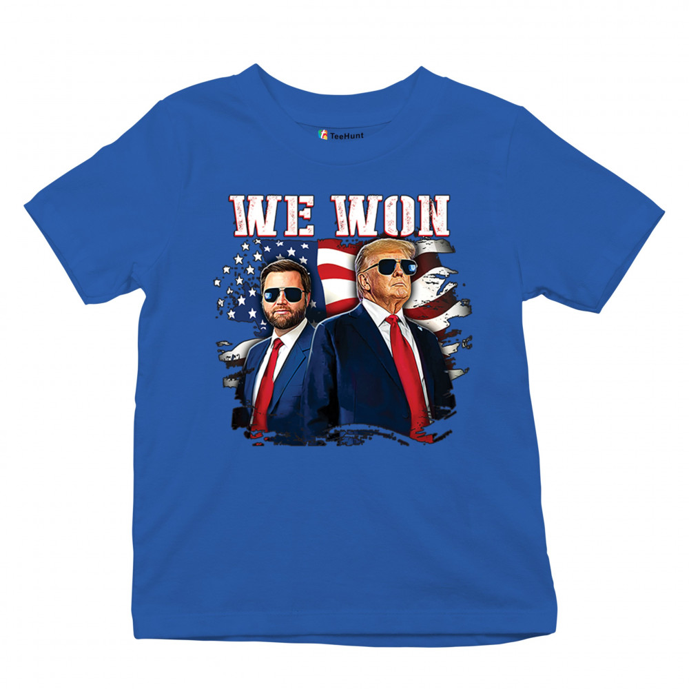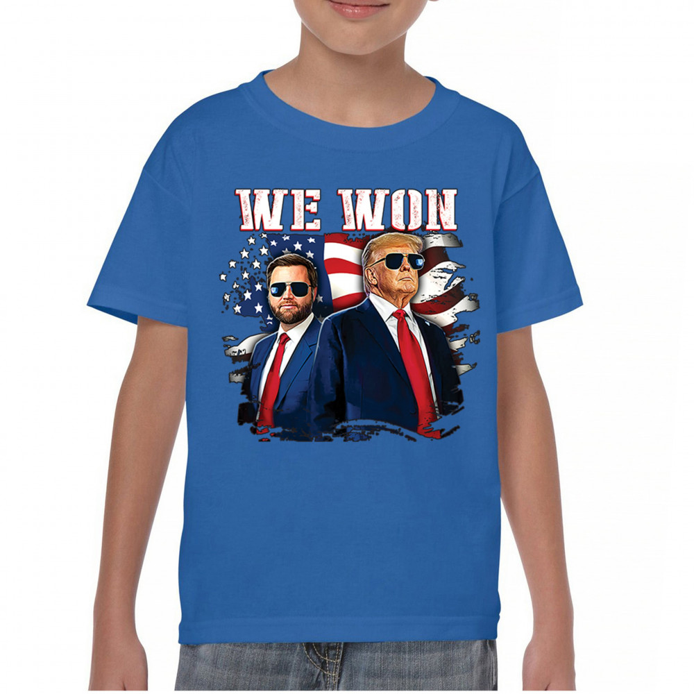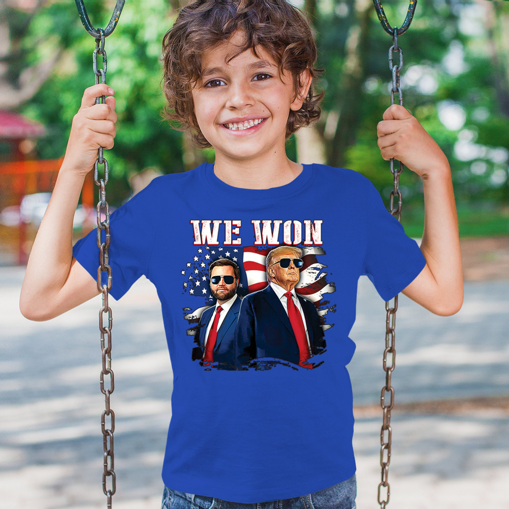 Celebrate Republican victory with this bold "We Won" design featuring Trump and patriotic flair—perfect for rallies, events, and patriotic pride.