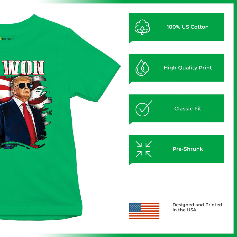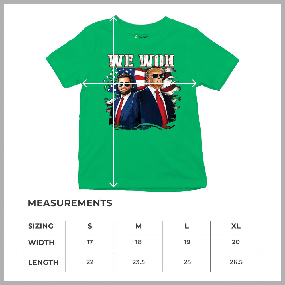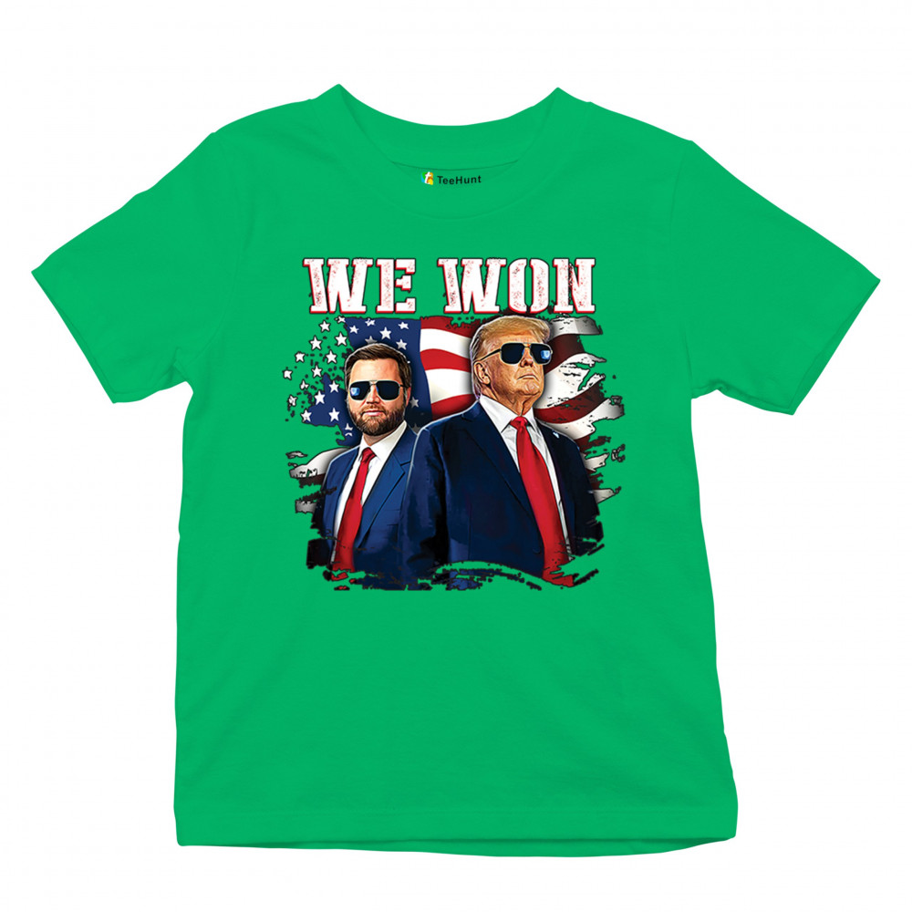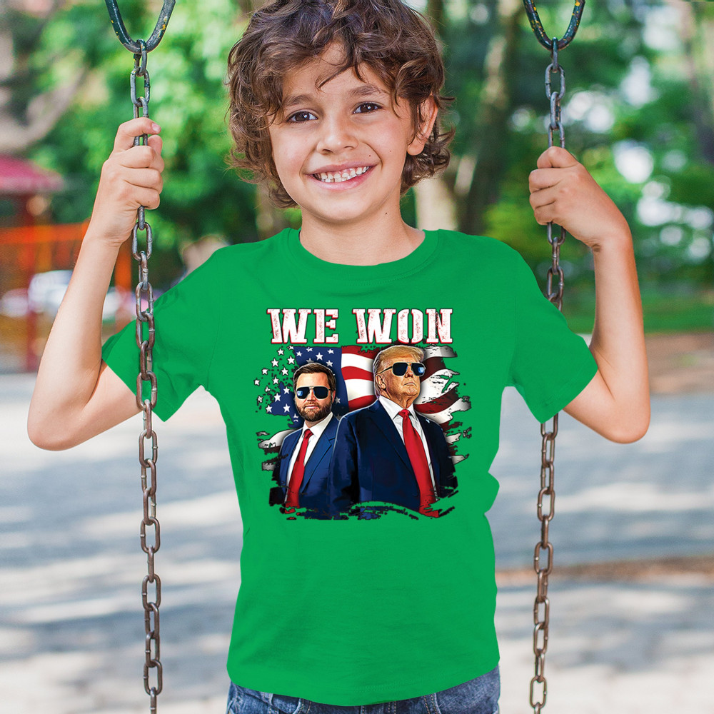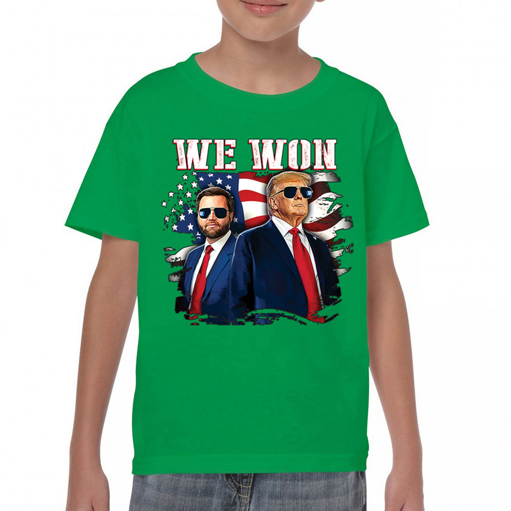 Celebrate Republican victory with this bold "We Won" design featuring Trump and patriotic flair—perfect for rallies, events, and patriotic pride.