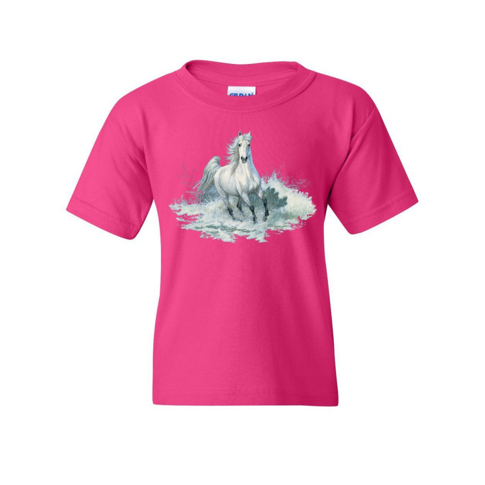 WHITE HORSE SPLASHING WATER youth t-shirt animal wild nature mustang kids tee hot pink