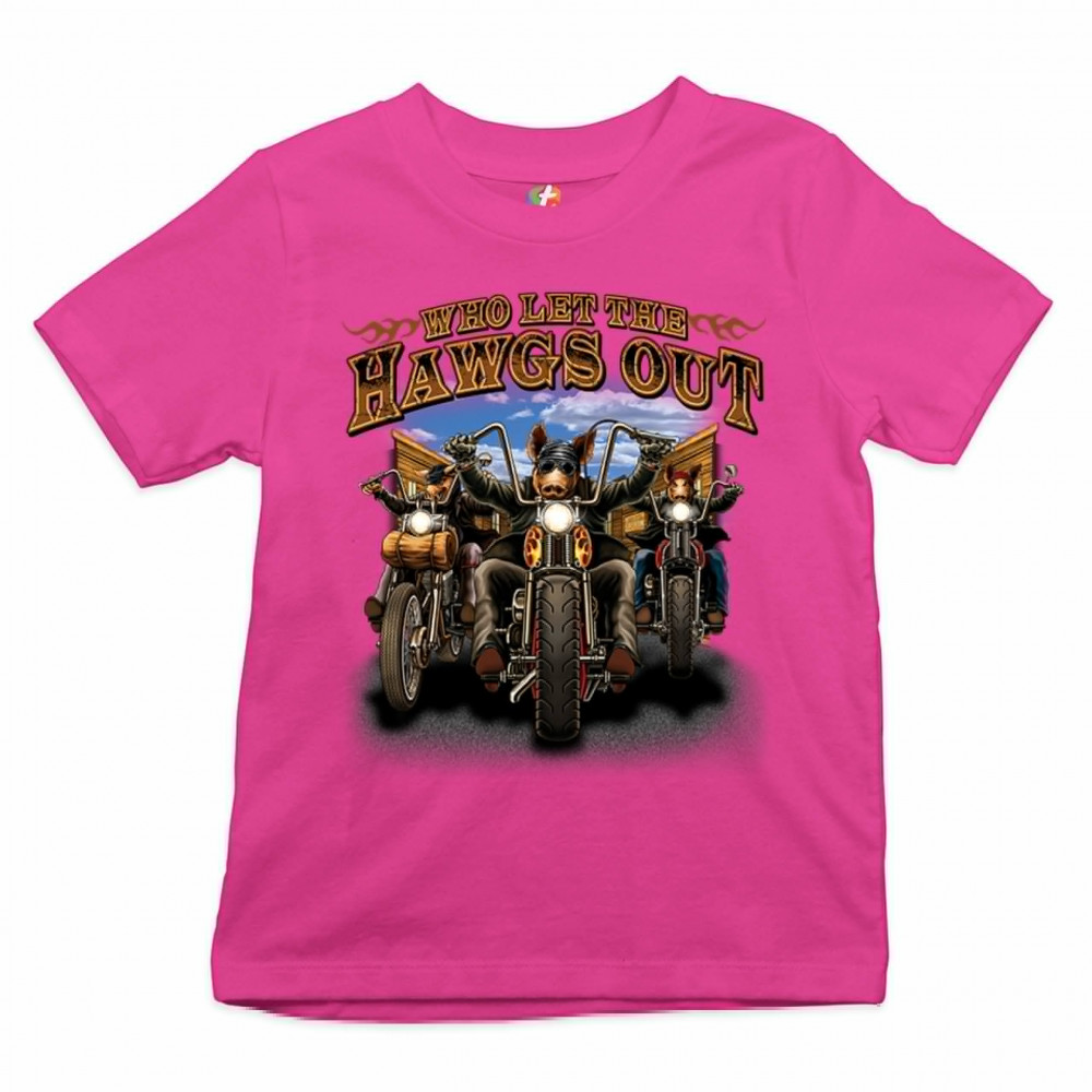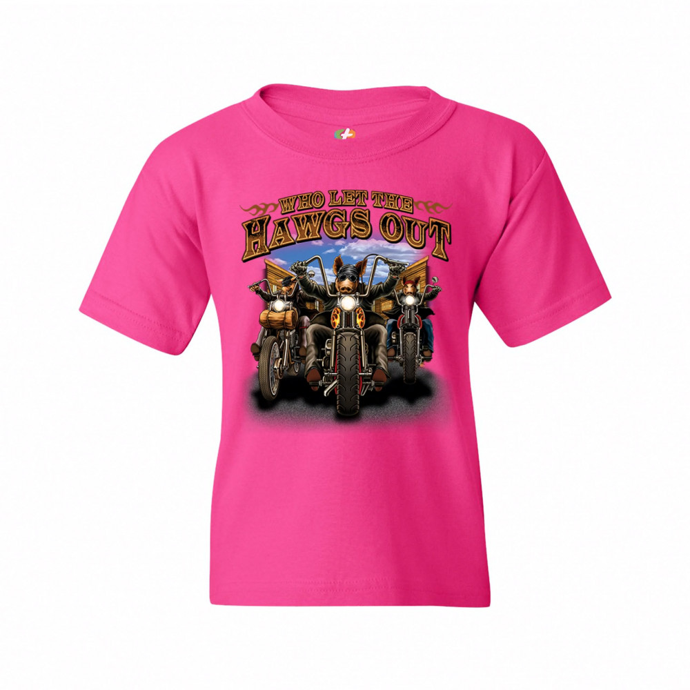 WHO LET THE HAWGS OUT youth t-shirt biker motorcycle gang live to ride kids pink