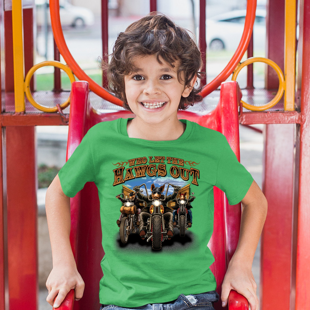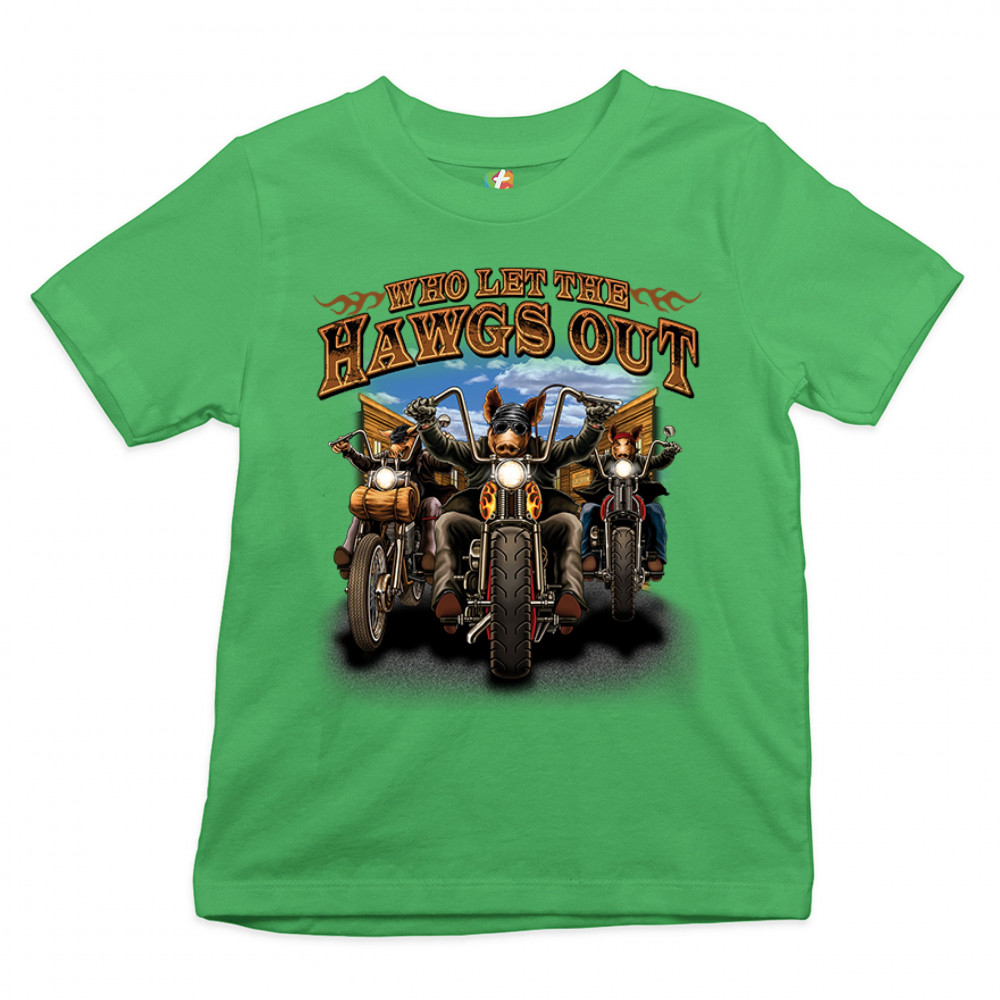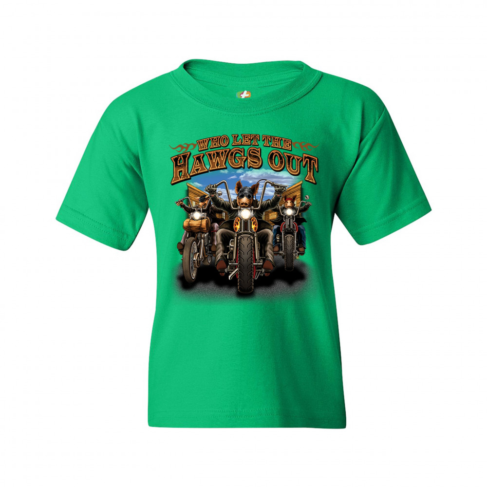 WHO LET THE HAWGS OUT youth t-shirt biker motorcycle gang live to ride kids green