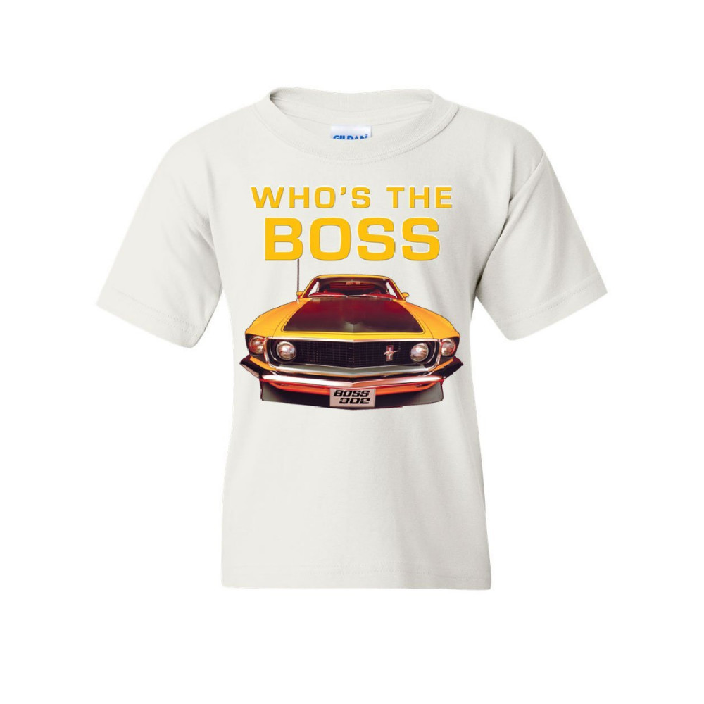 WHO'S THE BOSS? youth t-shirt ford mustang boss 302 classic muscle car kids tee white