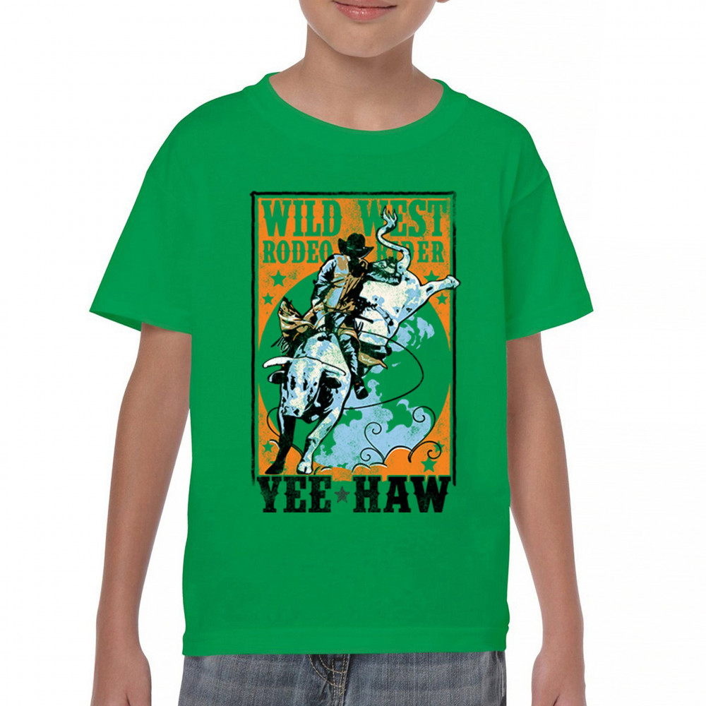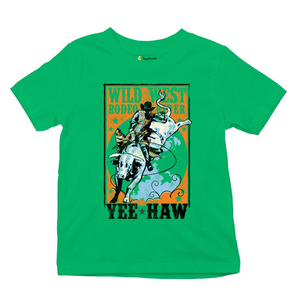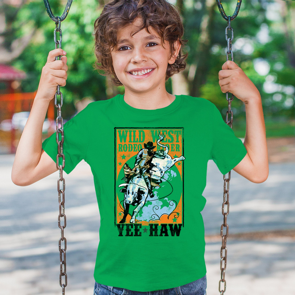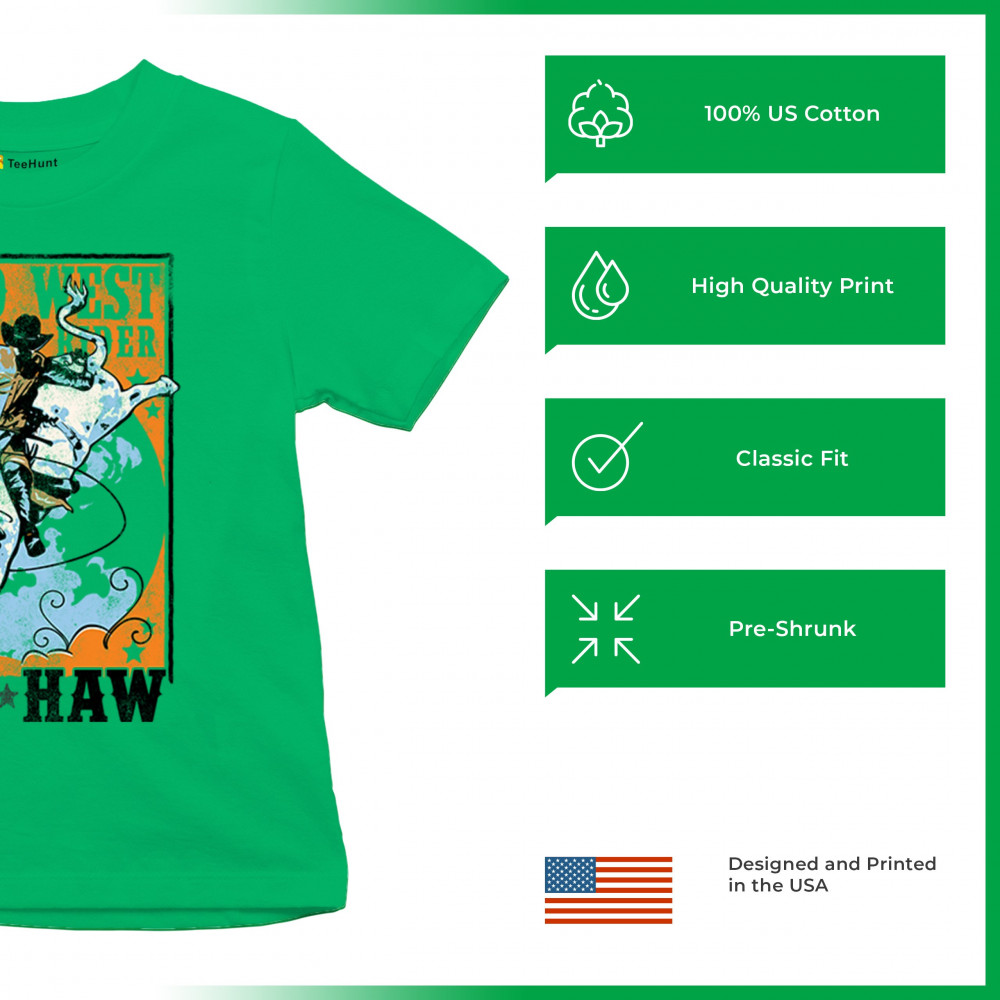 Bold cowboy bull riding design with orange backdrop, perfect for rodeo fans, western events, and country festivals.