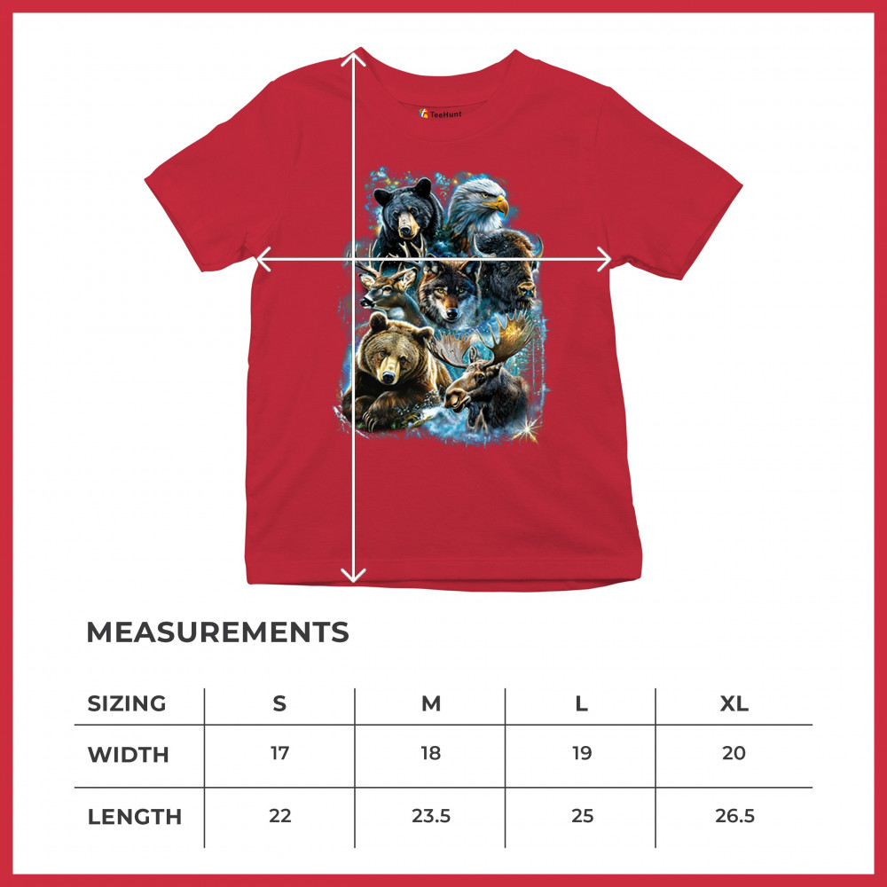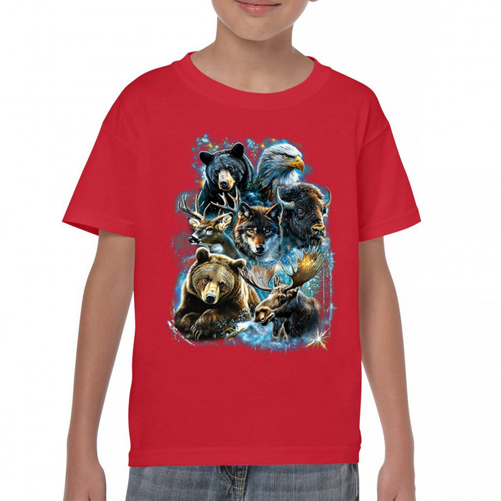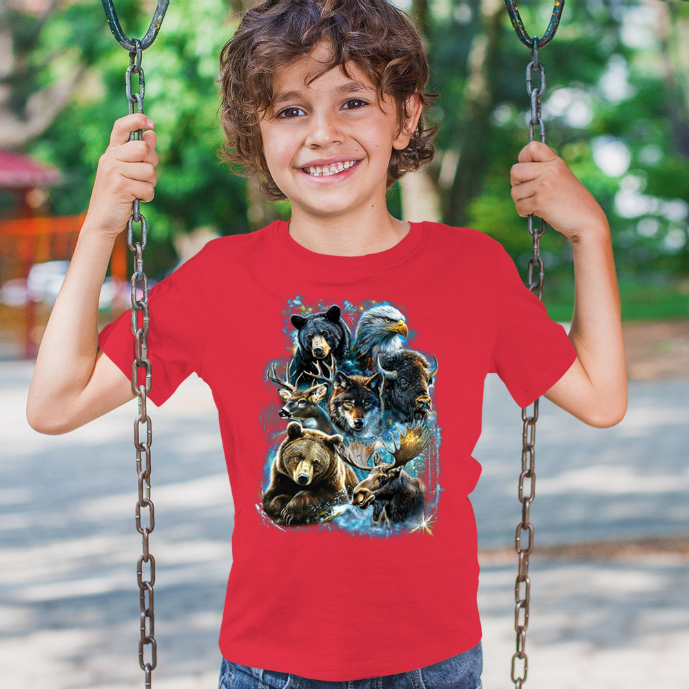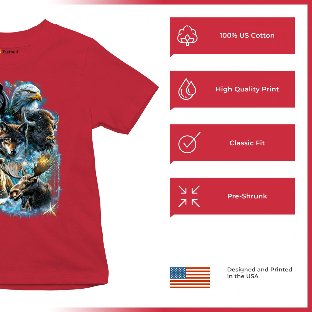 Wilderness design with moose, bear, eagle, bison, and wolf. A bold tribute to forest animals, nature strength, and rugged outdoor spirit.
