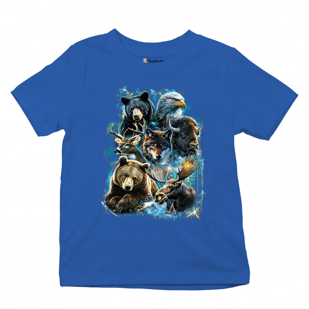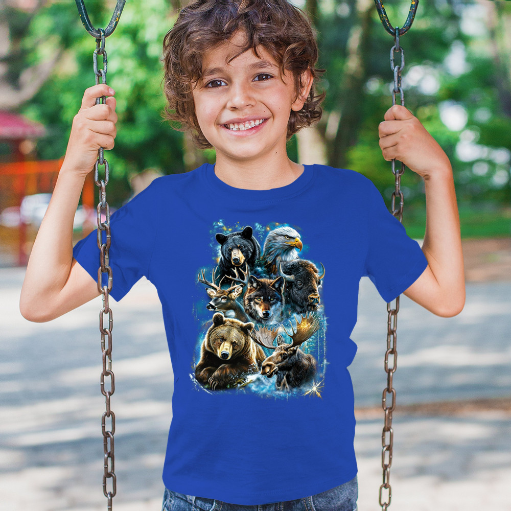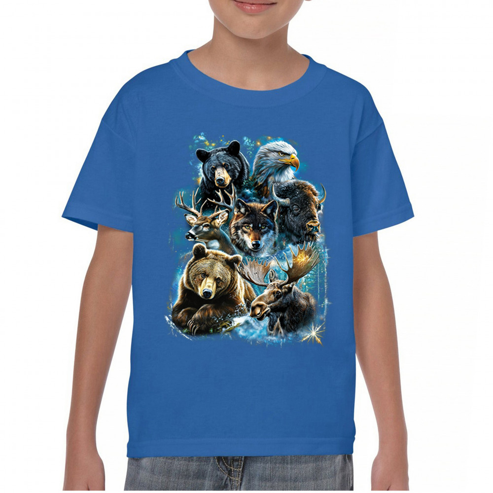 Wilderness design with moose, bear, eagle, bison, and wolf. A bold tribute to forest animals, nature strength, and rugged outdoor spirit.