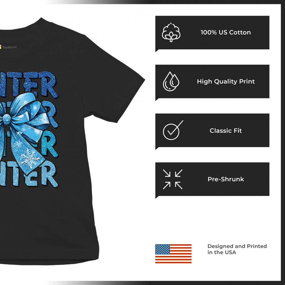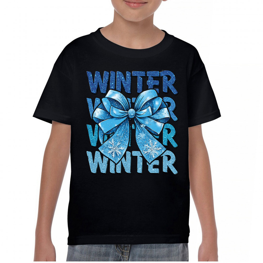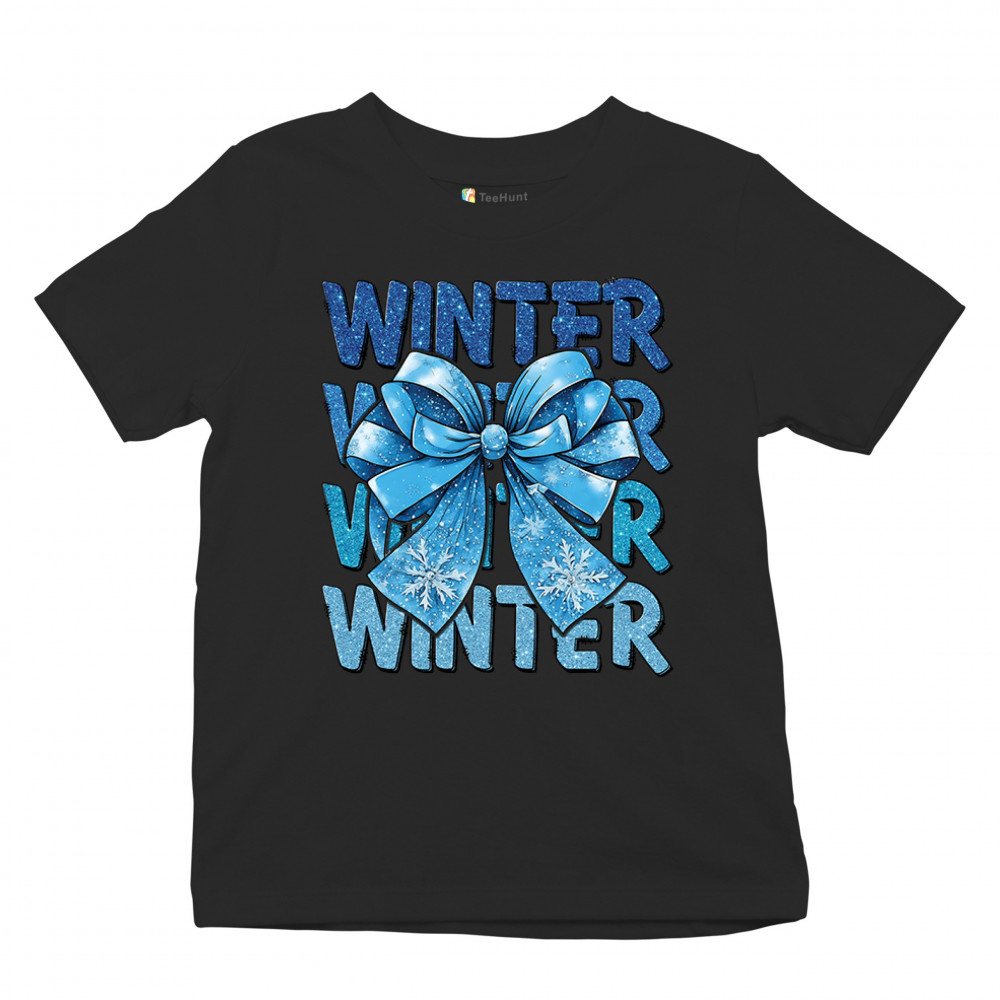 This shimmering winter bow design blends icy blue glitter style with bold repeating WINTER text for a bright seasonal statement. Snowflake accents and frosty tones create a cozy, cheerful vibe perfect for holiday outfits, gifting, or cold-weather lovers. A standout graphic that brings festive winter charm to any wardrobe and boosts seasonal search visibility.