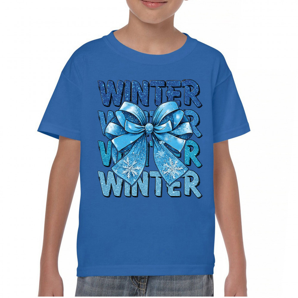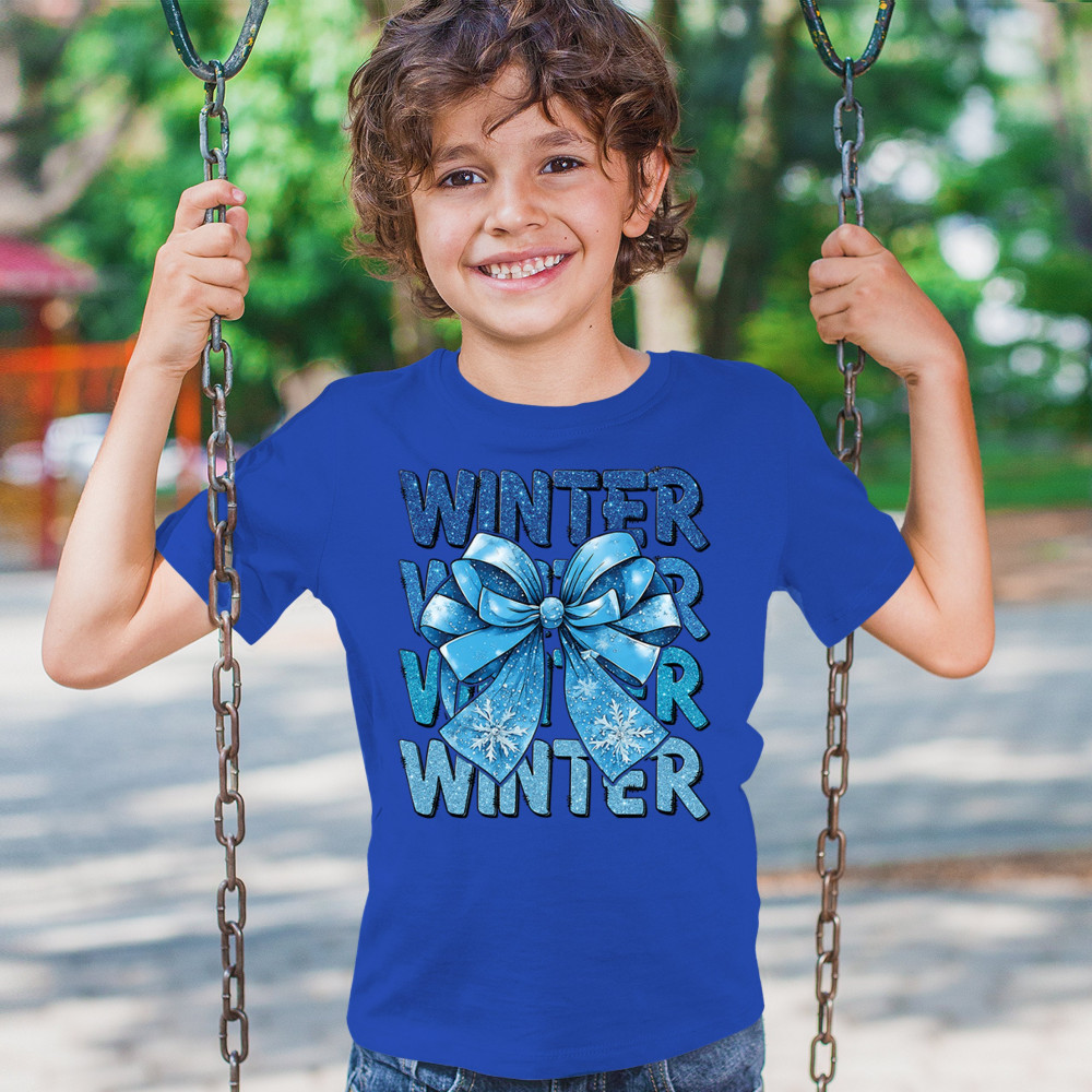 This shimmering winter bow design blends icy blue glitter style with bold repeating WINTER text for a bright seasonal statement. Snowflake accents and frosty tones create a cozy, cheerful vibe perfect for holiday outfits, gifting, or cold-weather lovers. A standout graphic that brings festive winter charm to any wardrobe and boosts seasonal search visibility.