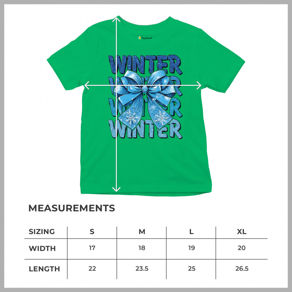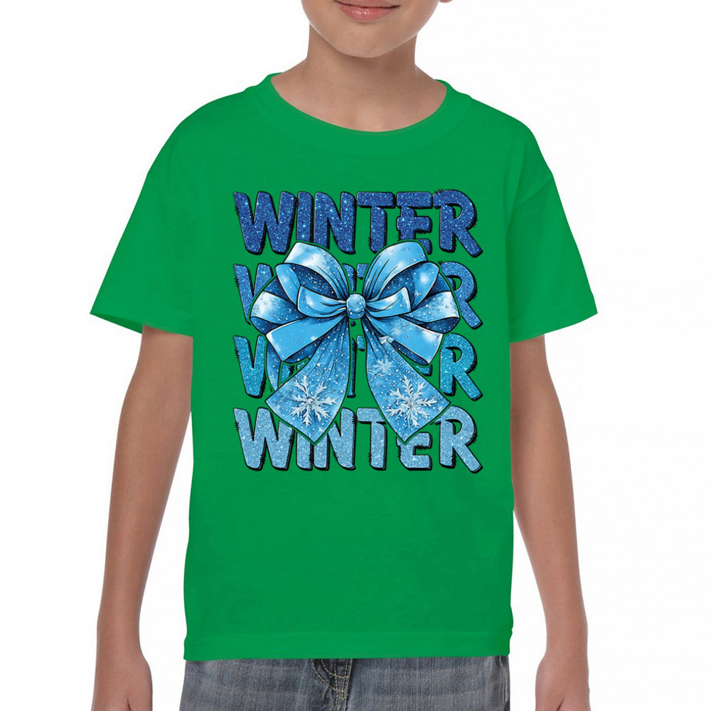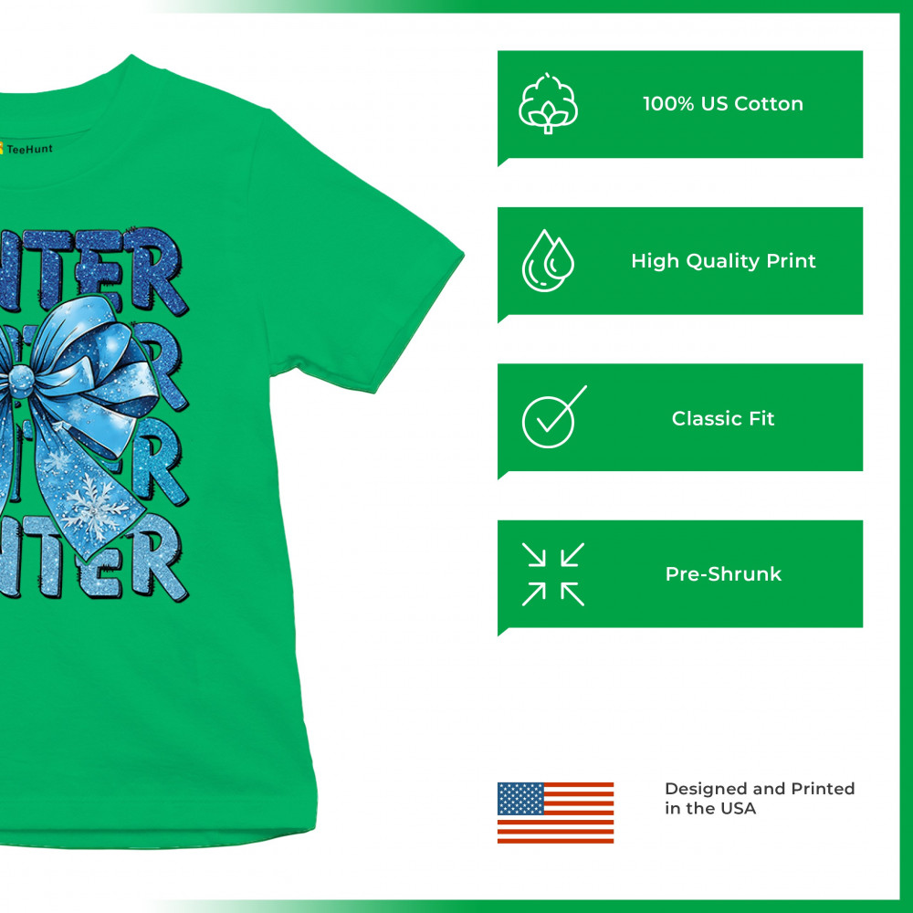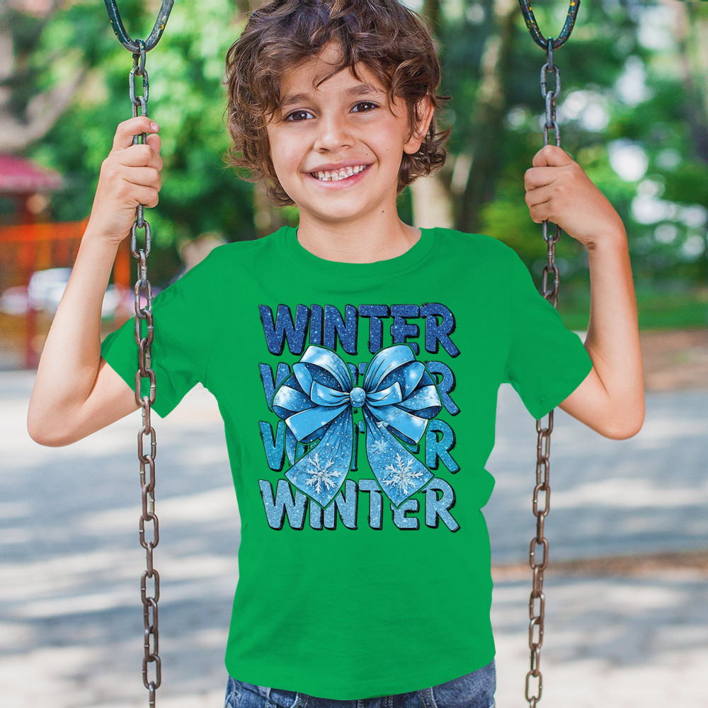 This shimmering winter bow design blends icy blue glitter style with bold repeating WINTER text for a bright seasonal statement. Snowflake accents and frosty tones create a cozy, cheerful vibe perfect for holiday outfits, gifting, or cold-weather lovers. A standout graphic that brings festive winter charm to any wardrobe and boosts seasonal search visibility.