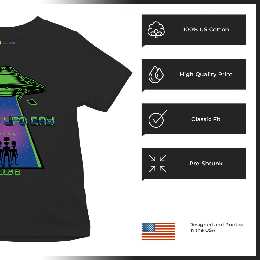 Join the celebration of World UFO Day with this unique design, featuring a detailed UFO beaming up three cheerful aliens with the phrase "Get in, loser." Perfect for those who are fascinated by the unknown and have a sense of humor about extraterrestrial life. Whether you're attending a UFO event, meeting with fellow enthusiasts, or just want to express your quirky style, this design is a must-have. Embrace the spirit of curiosity and fun with this eye-catching design for July 2nd.