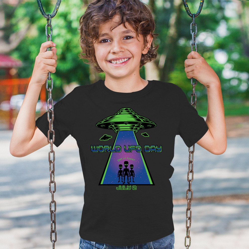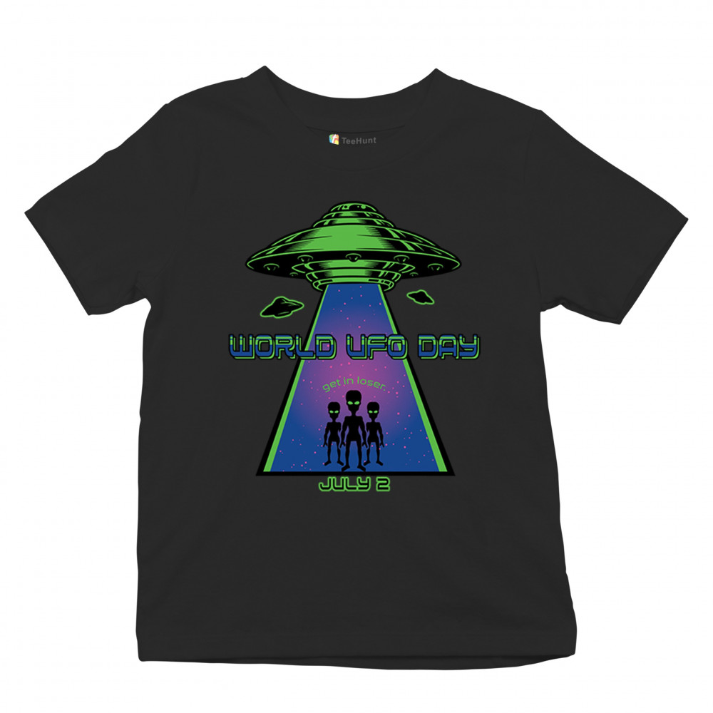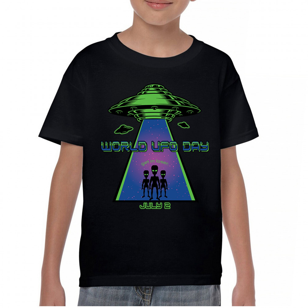 WORLD UFO DAY GET IN LOSER youth t-shirt funny aliens flying saucer space kids black