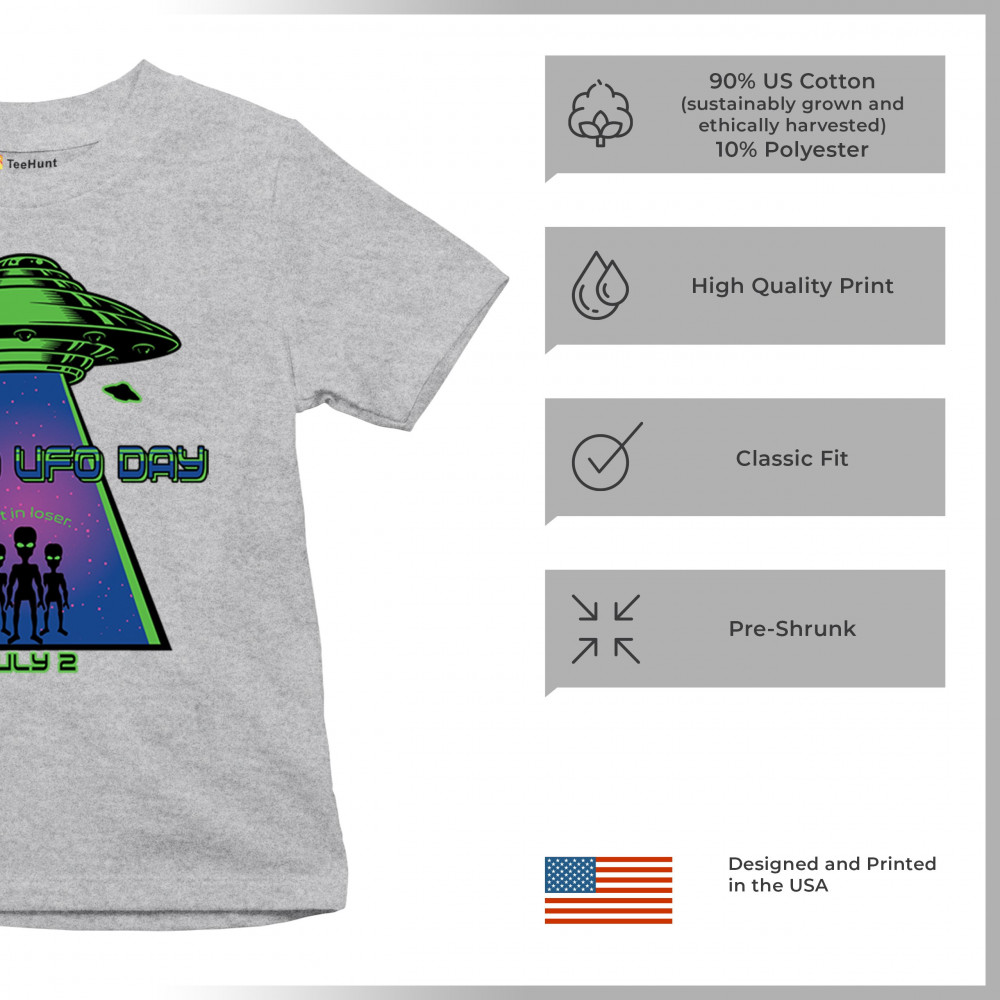 Join the celebration of World UFO Day with this unique design, featuring a detailed UFO beaming up three cheerful aliens with the phrase "Get in, loser." Perfect for those who are fascinated by the unknown and have a sense of humor about extraterrestrial life. Whether you're attending a UFO event, meeting with fellow enthusiasts, or just want to express your quirky style, this design is a must-have. Embrace the spirit of curiosity and fun with this eye-catching design for July 2nd.