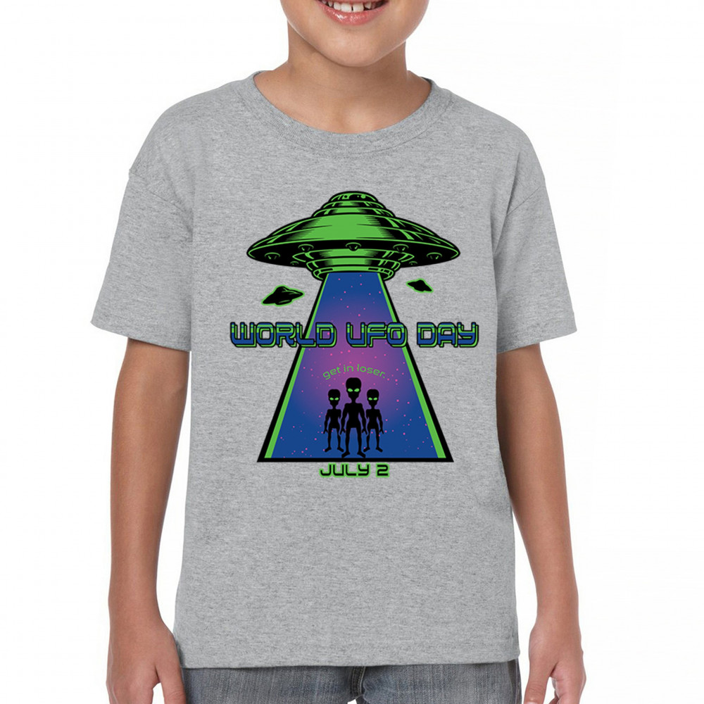 Celebrate World UFO Day with a vibrant design featuring a UFO and three playful aliens with "Get in, loser." Perfect for UFO enthusiasts and alien humor lovers.