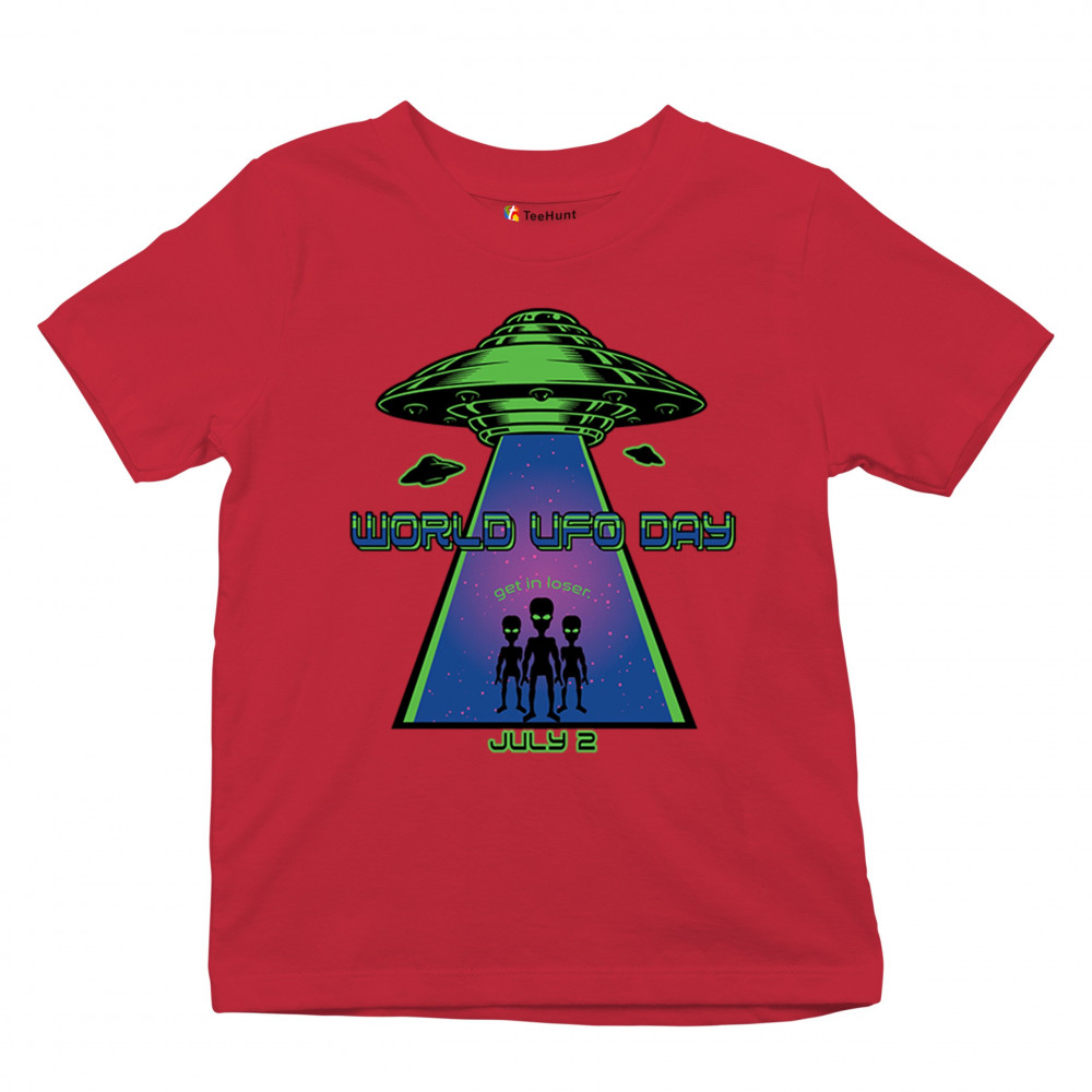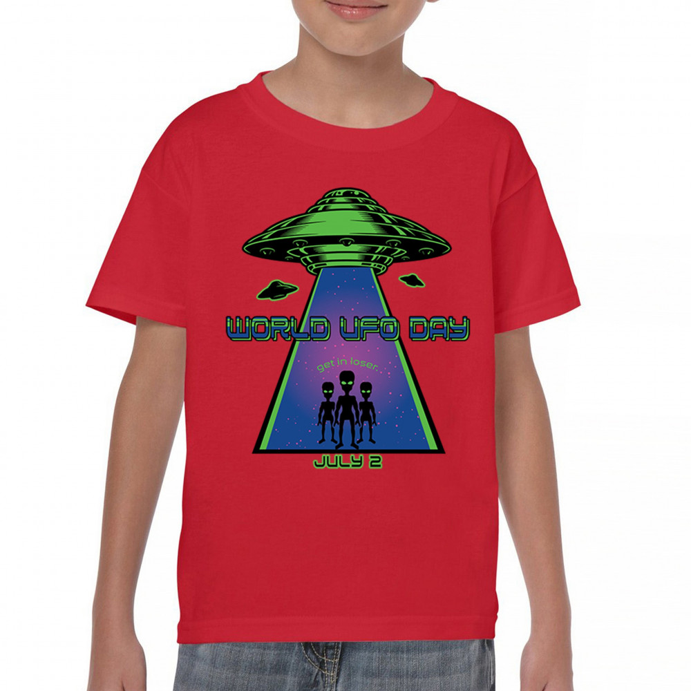 Celebrate World UFO Day with a vibrant design featuring a UFO and three playful aliens with "Get in, loser." Perfect for UFO enthusiasts and alien humor lovers.