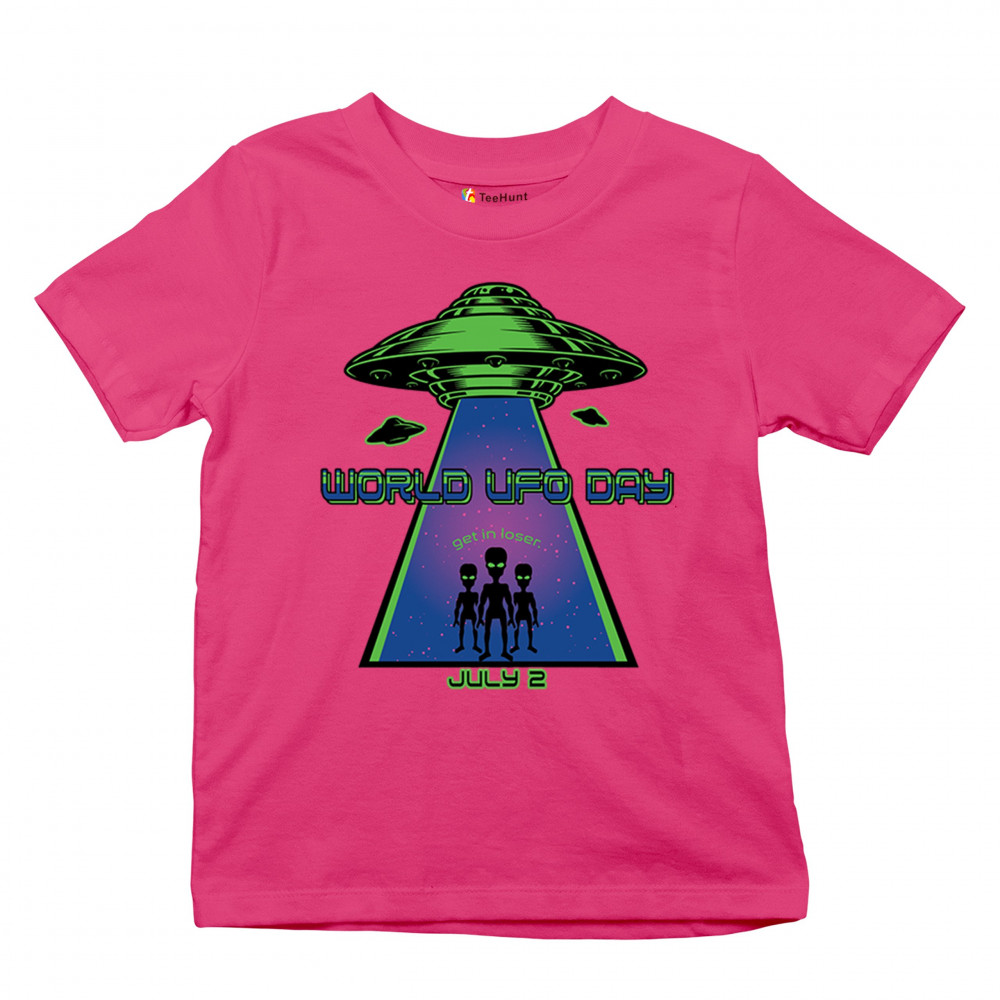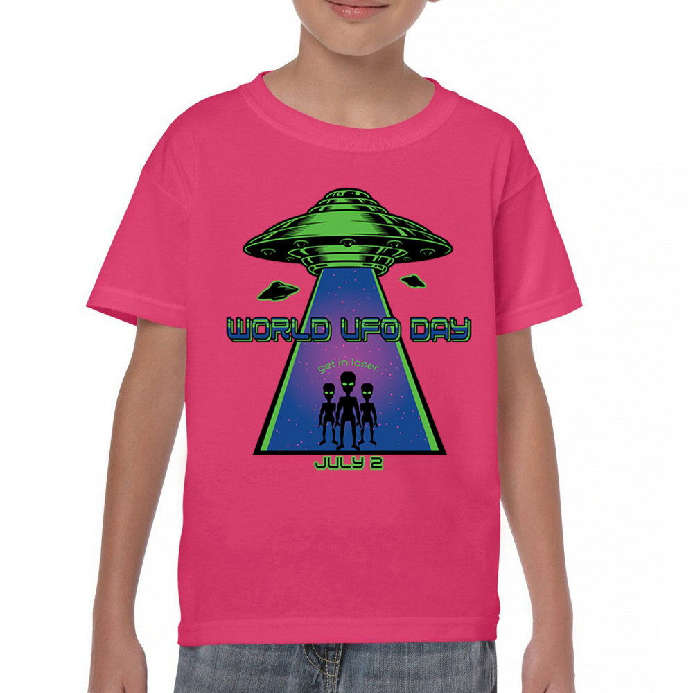 Celebrate World UFO Day with a vibrant design featuring a UFO and three playful aliens with "Get in, loser." Perfect for UFO enthusiasts and alien humor lovers.