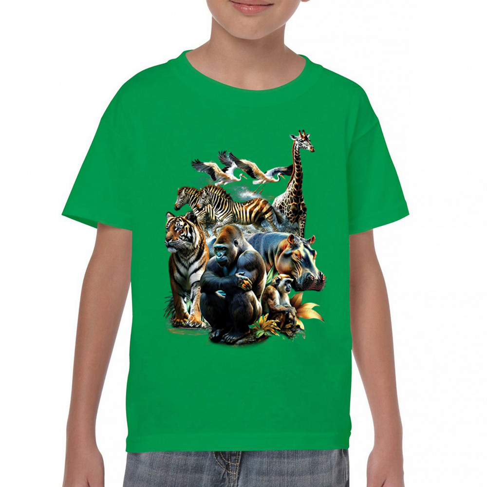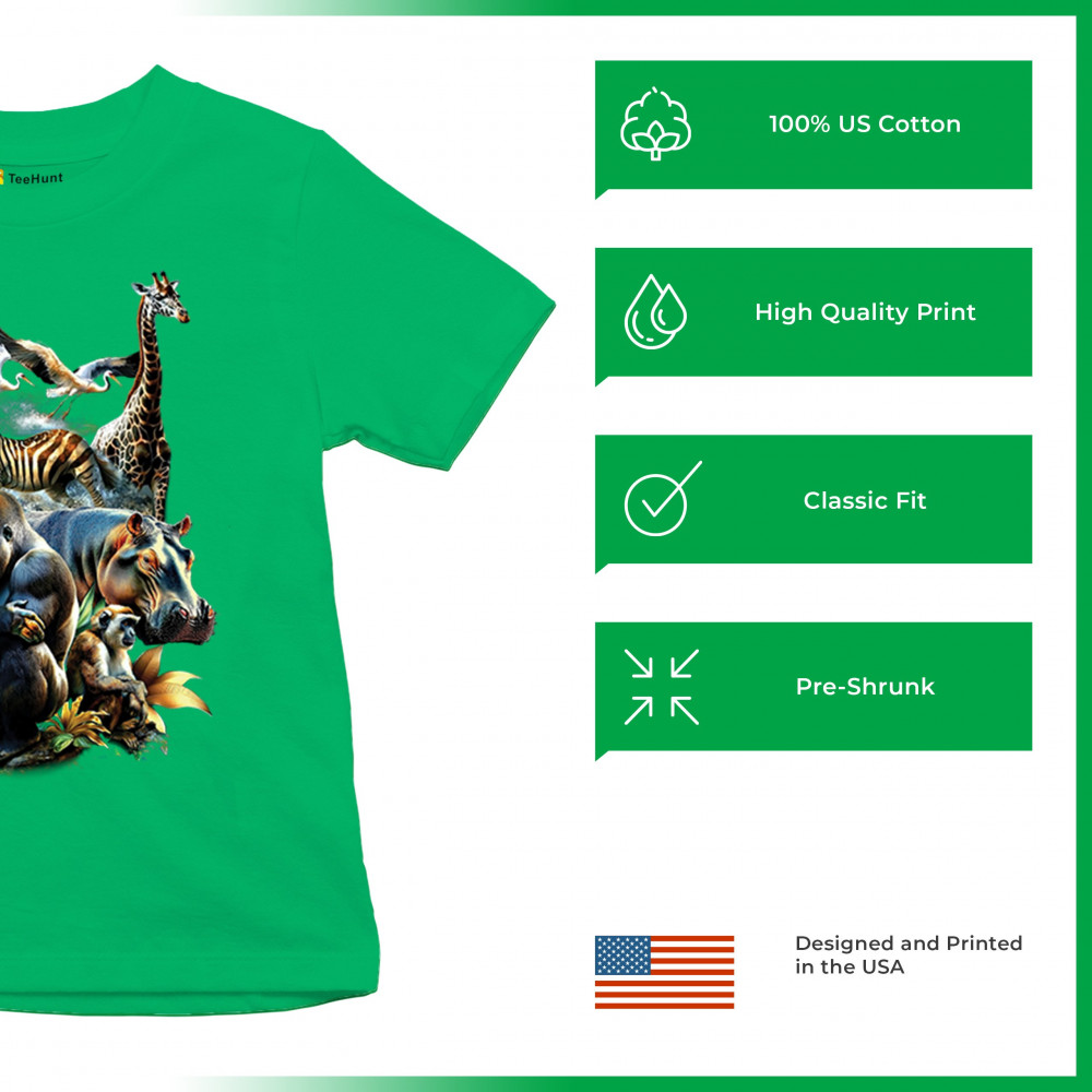 Packed with fierce energy and vibrant color, this wildlife design features a jungle coalition of gorilla, tiger, monkey, zebra, giraffe, hippo, and birds. A powerful tribute to animal beauty, biodiversity, and nature's harmony. Perfect for jungle tour enthusiasts, zoo visitors, or anyone passionate about wild conservation and stunning creature art.