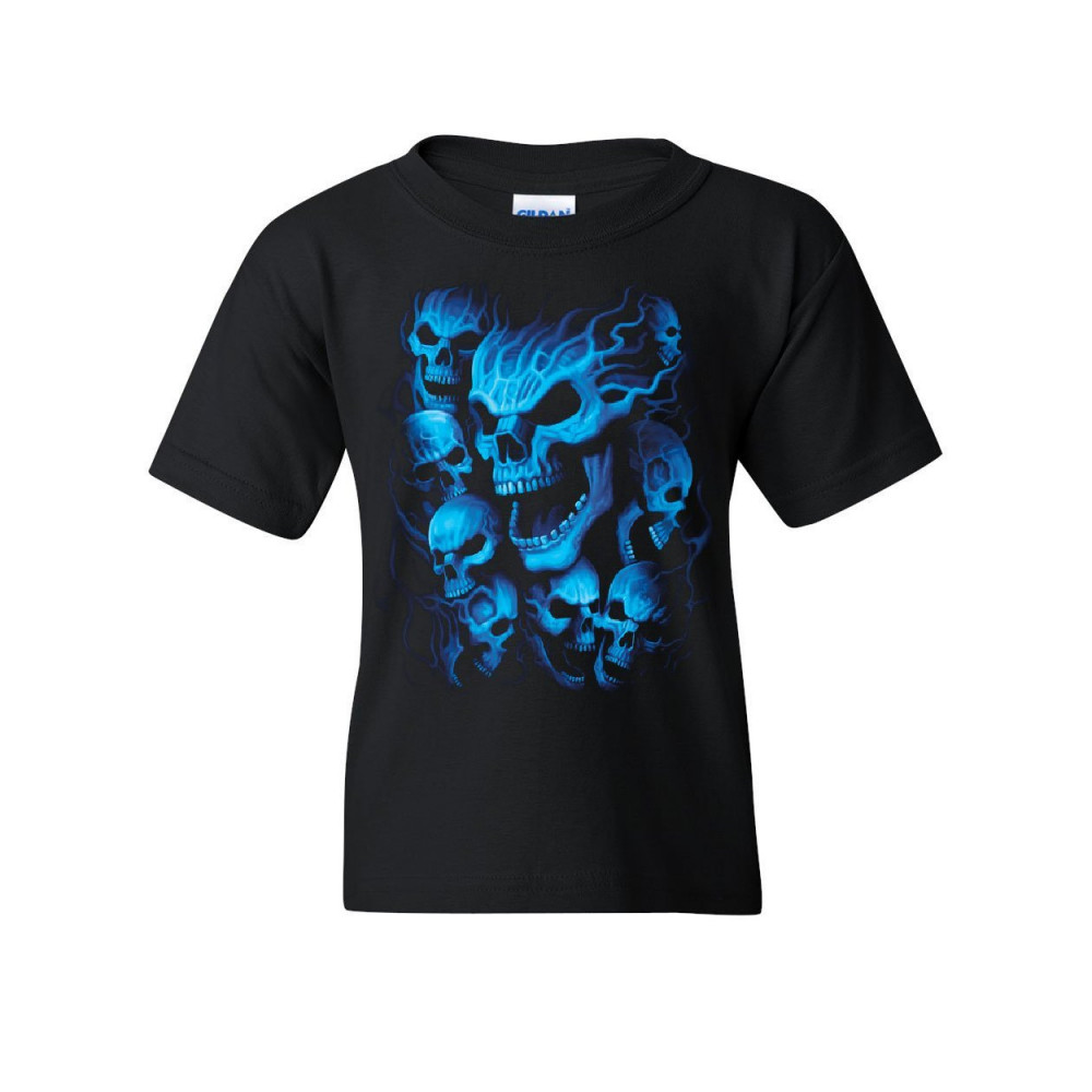BLUE SKULLS youth t-shirt skull face death dead reaper hell evil demon kids tee black