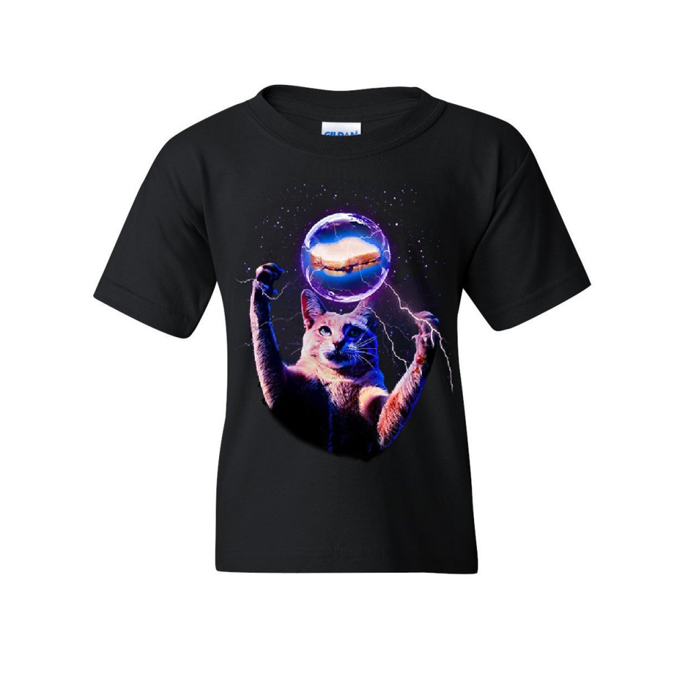 CAT CATCHING A PB&J cat catching a sandwich youth t-shirt plasma ball kitty kitten weird kids tee black