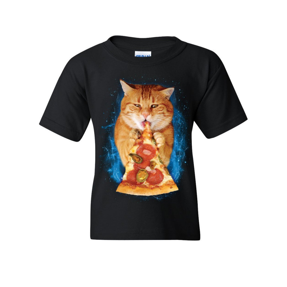 CAT EATING PIZZA youth t-shirt funny weird kitten pet kitty peperoni kids tee black