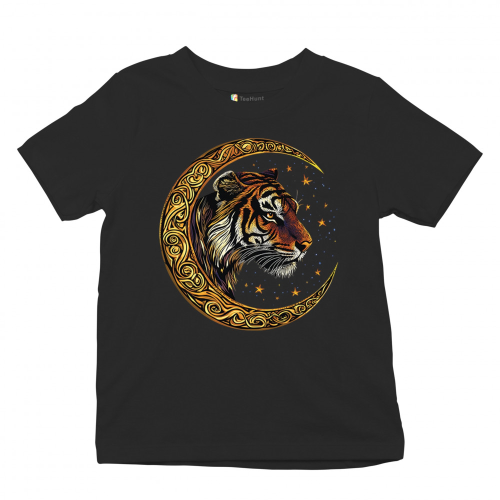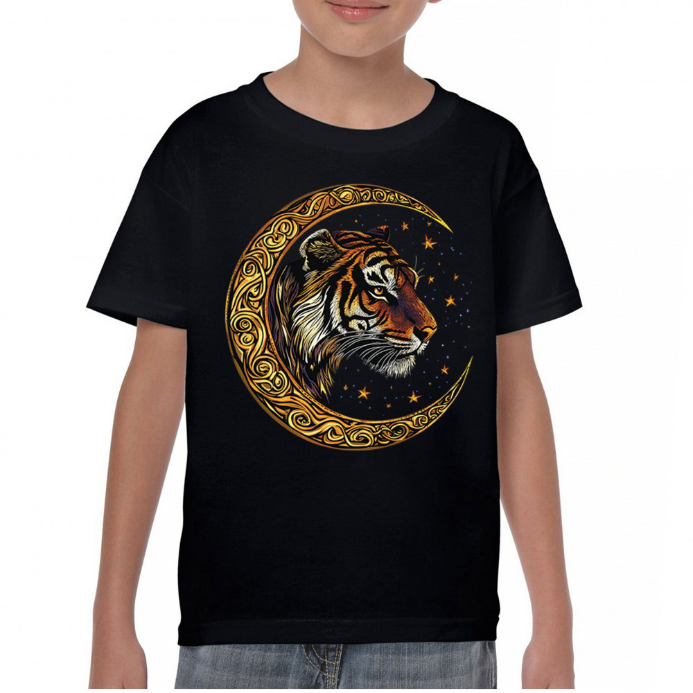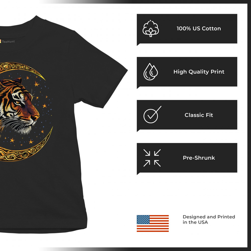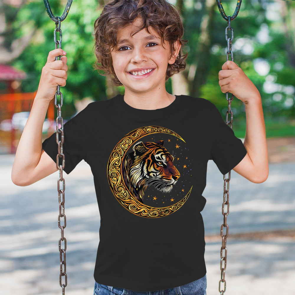 Bold tiger design in Celtic moon with cosmic sky. Symbol of strength, instinct, and jungle mysticism. Great for animal lovers and fantasy fans.