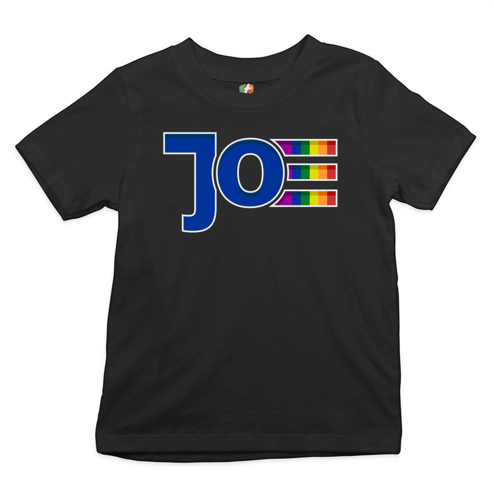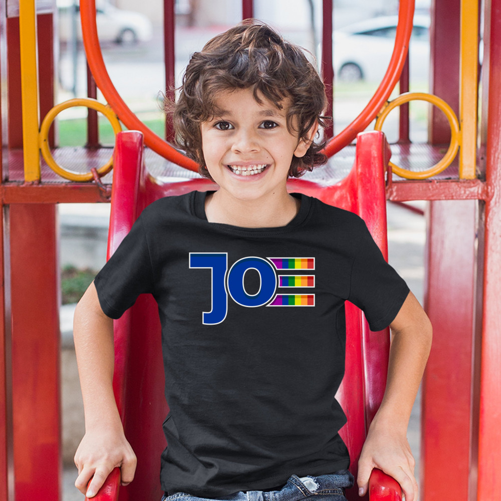 A political print featuring the name of the democratic presidential candidate "Joe". The letter "e" is painted with the colors of the lgbt rainbow. It is a great choice to wear to show your support for the democratic presidential nominee and his vice pres