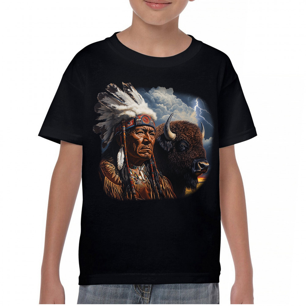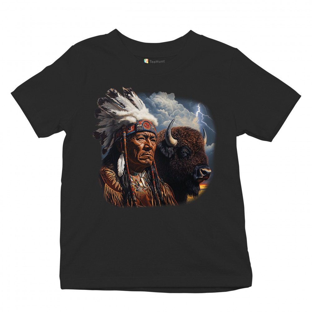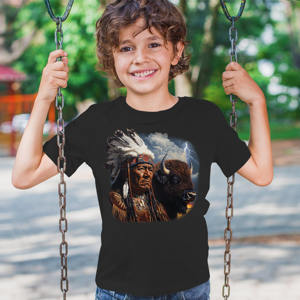 Bold tribal elder and bison design framed by lightning sky—honoring heritage, strength, resilience, and sacred connection to nature.