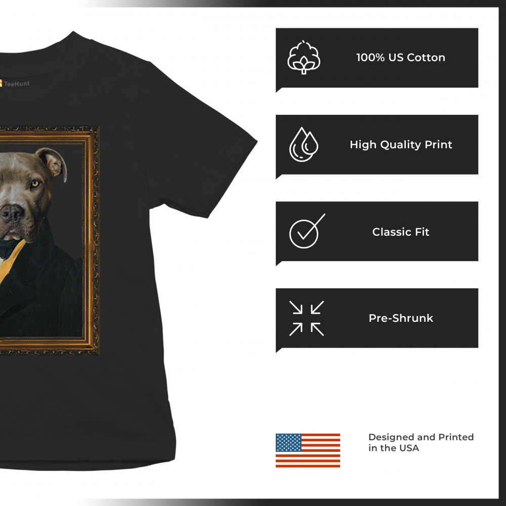 Unique pit bull portrait in 18th-century attire, blending humor and elegance for pet lovers and history enthusiasts. Perfect for home or office decor.