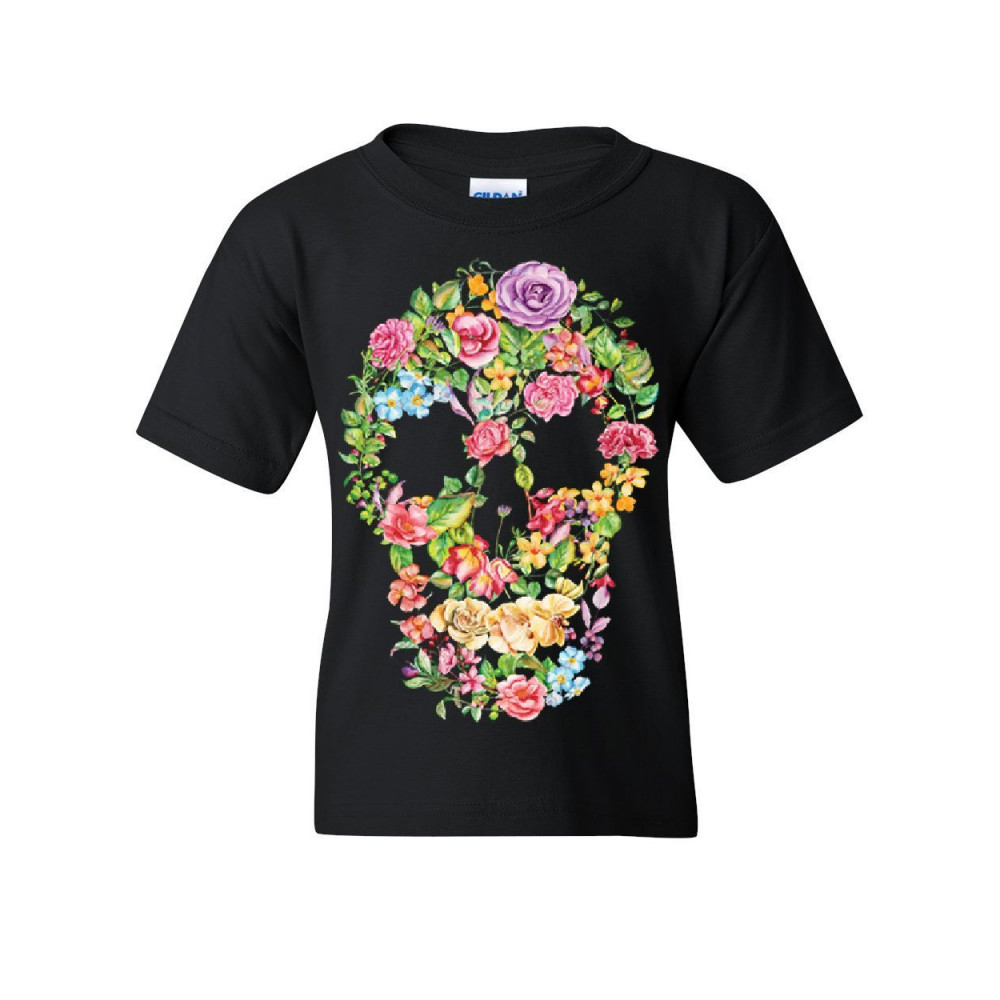 FLOWER SKULL youth t-shirt sugar skull calavera dia de los muertos kids tee black
