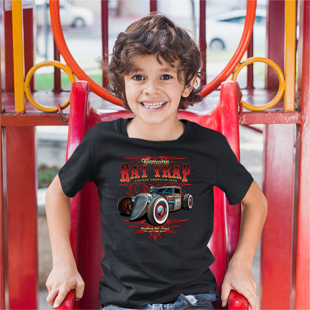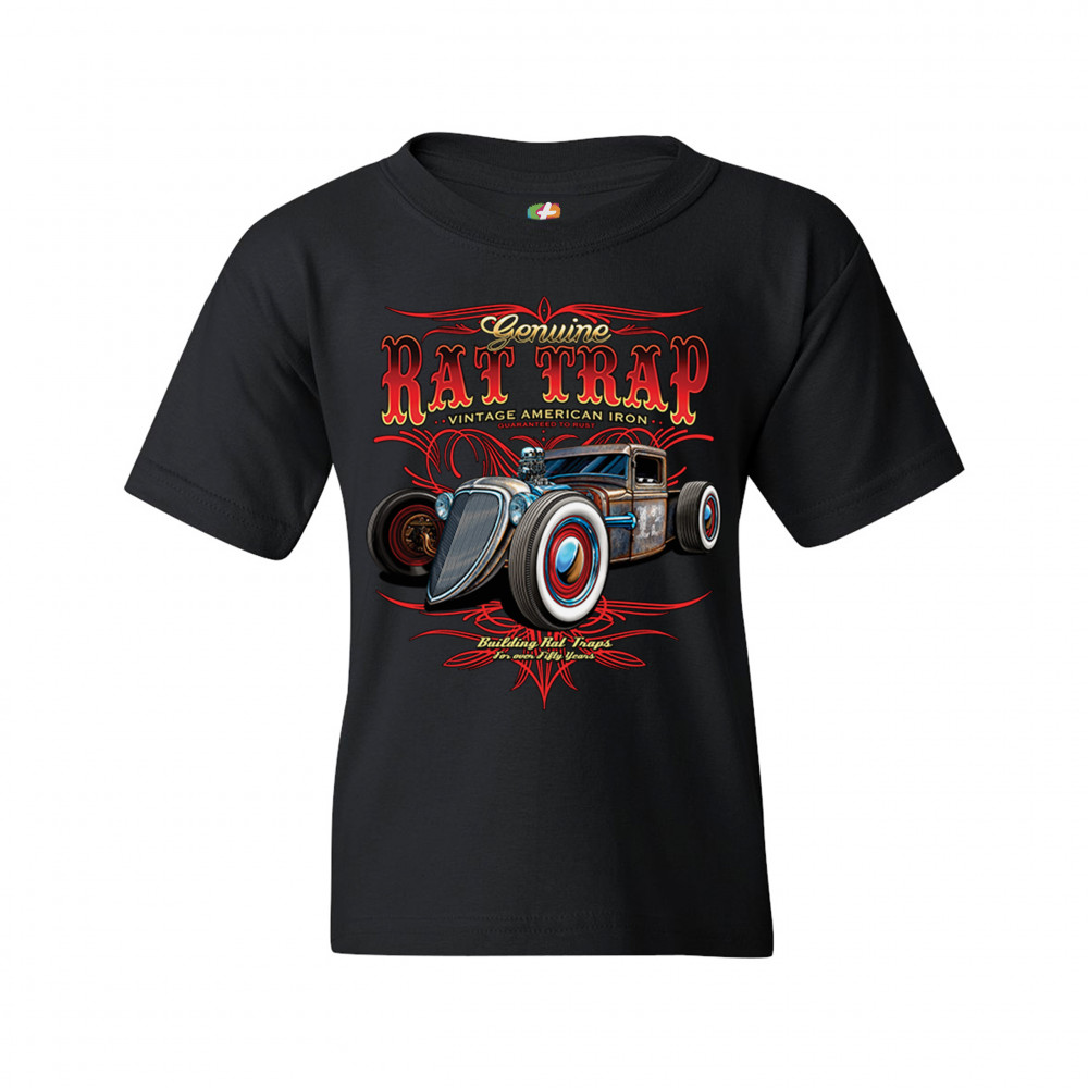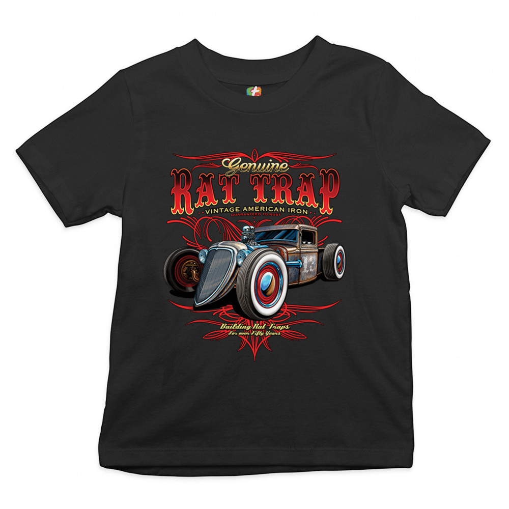 A print featuring a rusty rat rod with a number "13" on it's door. The prints says: "genuine rat trap, vintage American iron, guaranteed to rust" above the car and "bulding rat traps for over fifty years" below it. Great for Route 66 and hot rod fans.