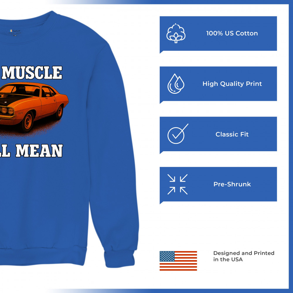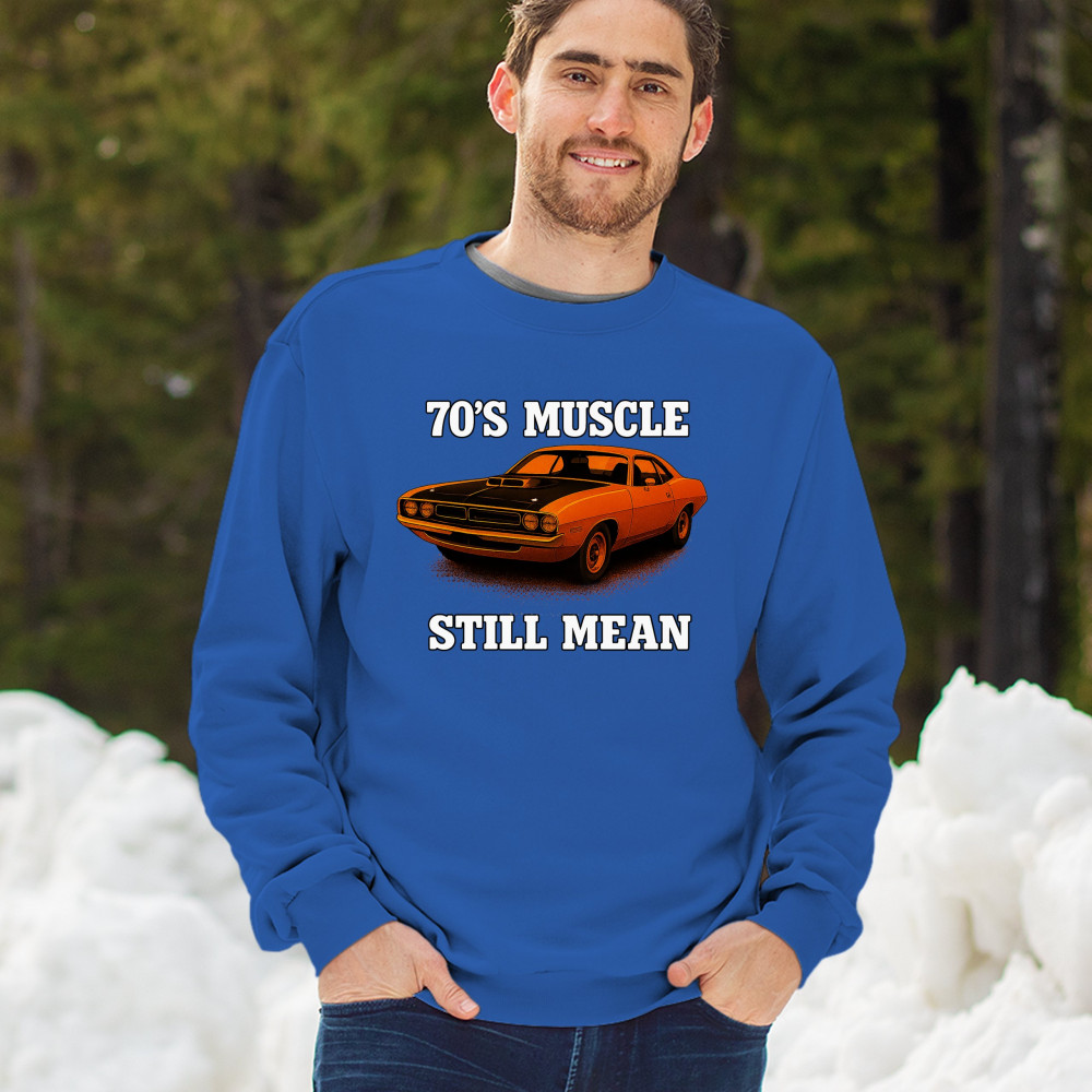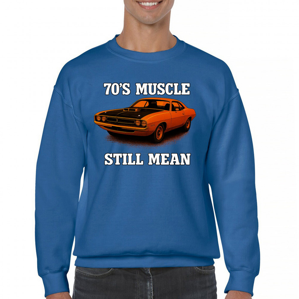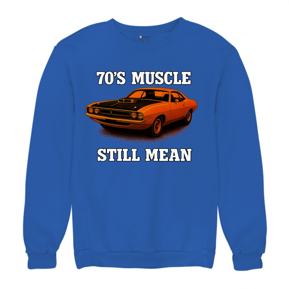 1970'S AMERICAN MUSCLE CAR sweatshirt classic performance still mean crewneck royal blue