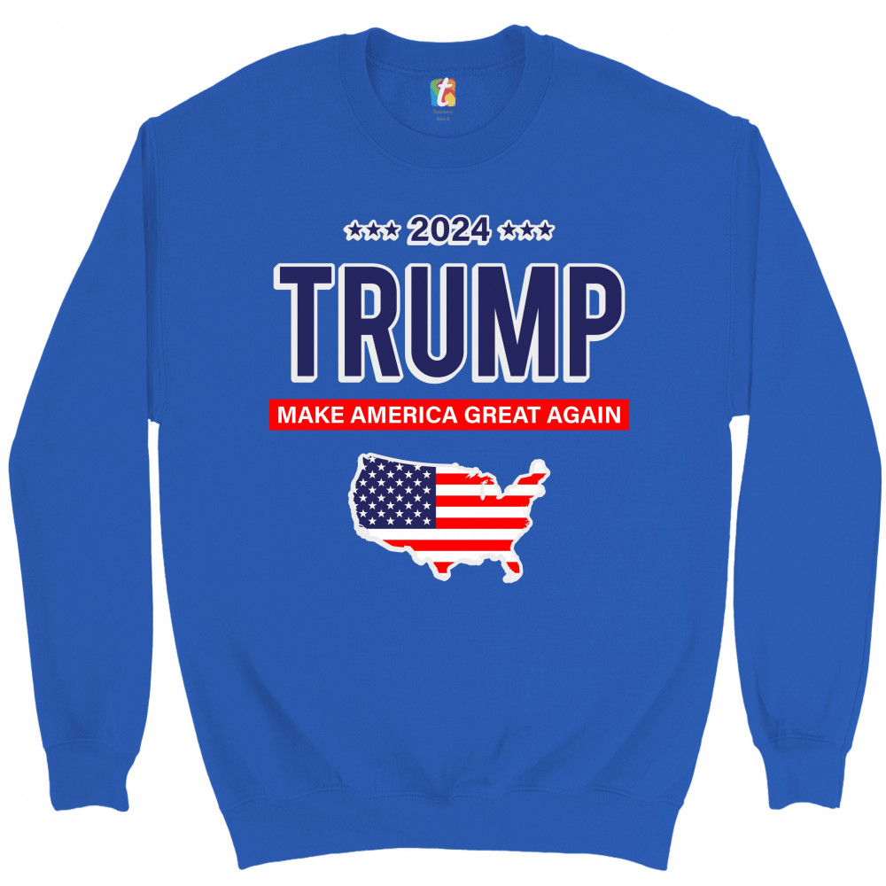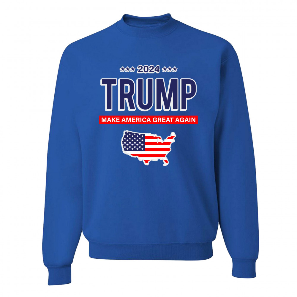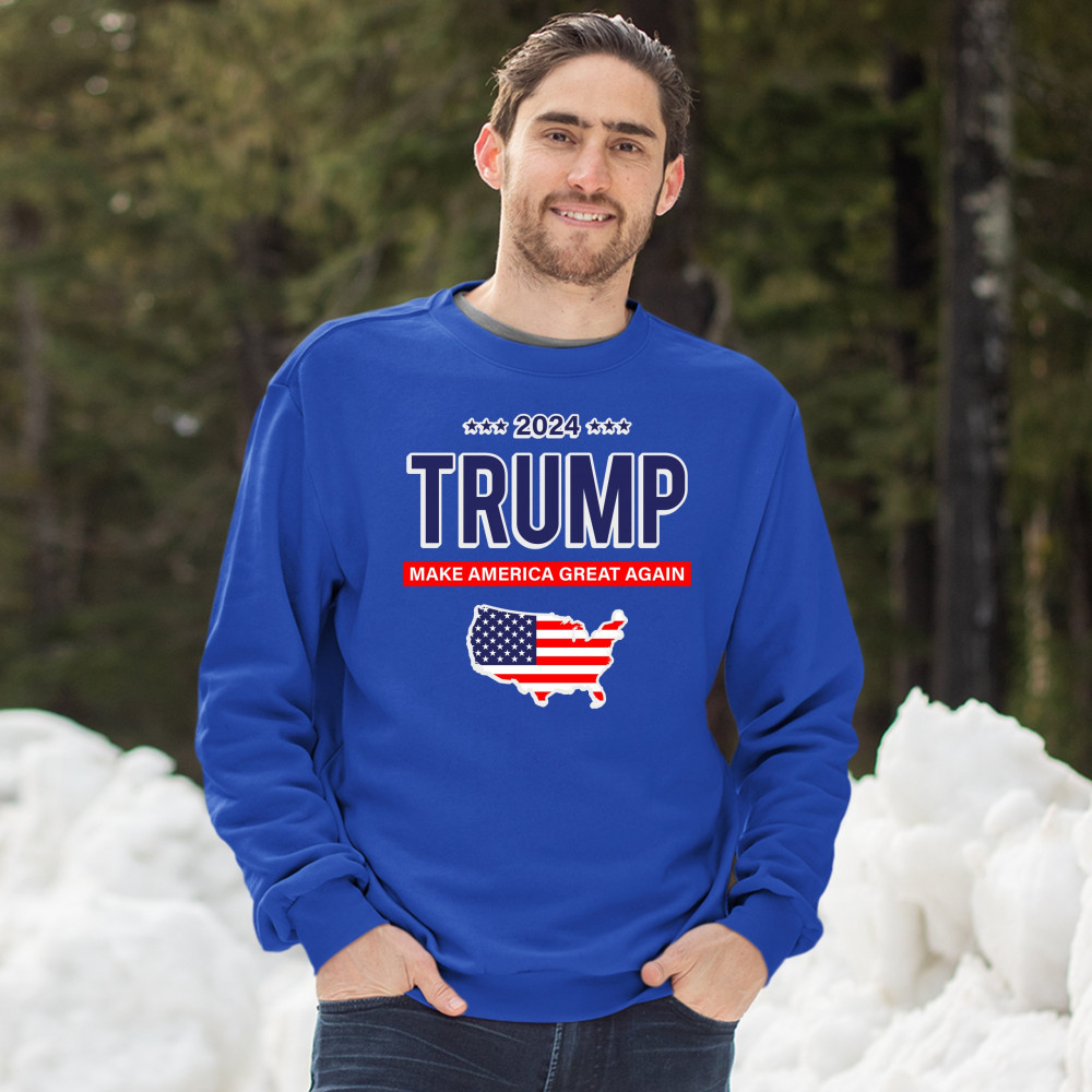 A political print saying "2024 Trump Make America Great Again" and features the silhouette of the USA with the American flag inside of it. A great choice to wear for a Trump rally or give as a gift to a Donald Trump supporter before 2024 presidential elec