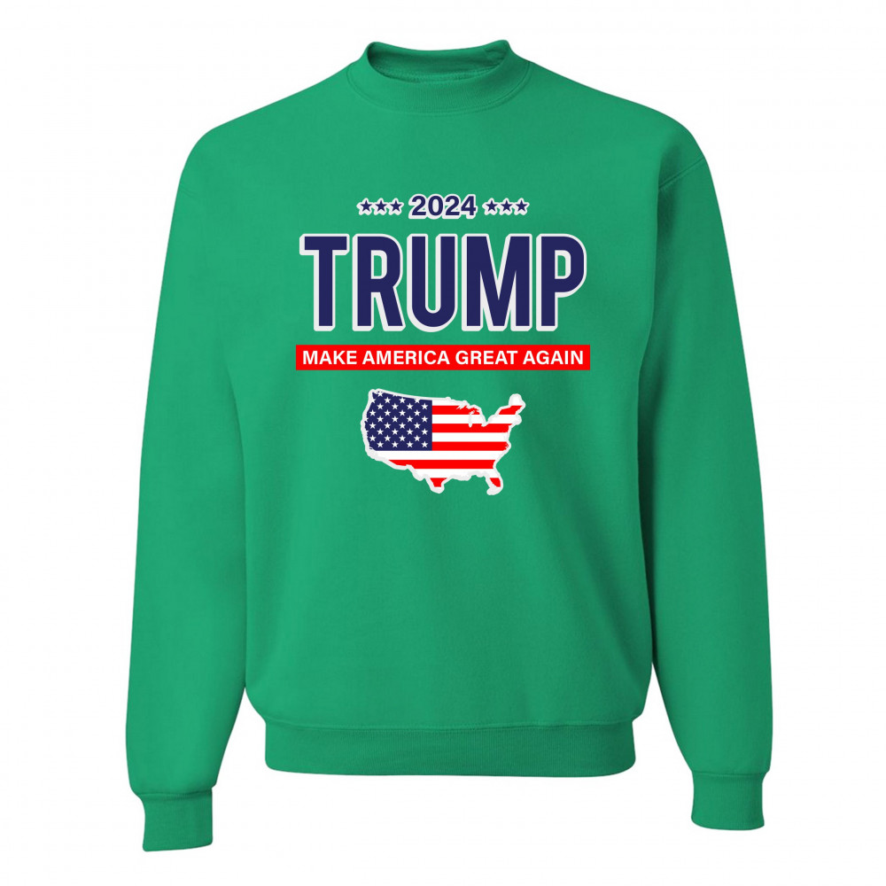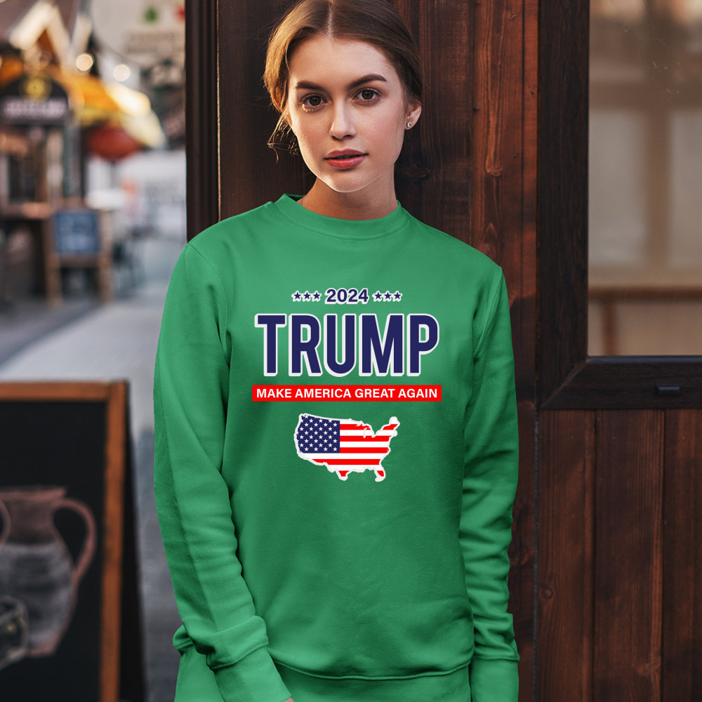 A political print saying "2024 Trump Make America Great Again" and features the silhouette of the USA with the American flag inside of it. A great choice to wear for a Trump rally or give as a gift to a Donald Trump supporter before 2024 presidential elec