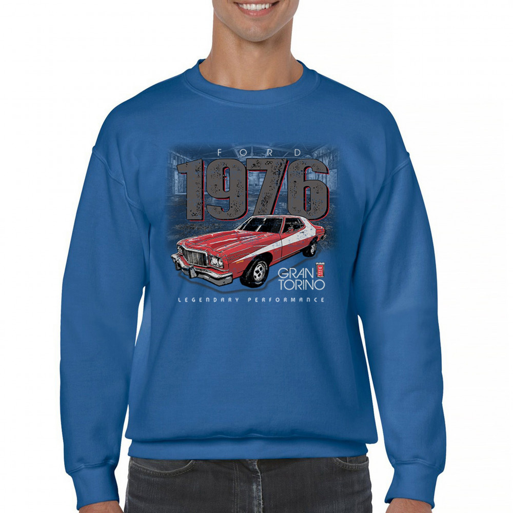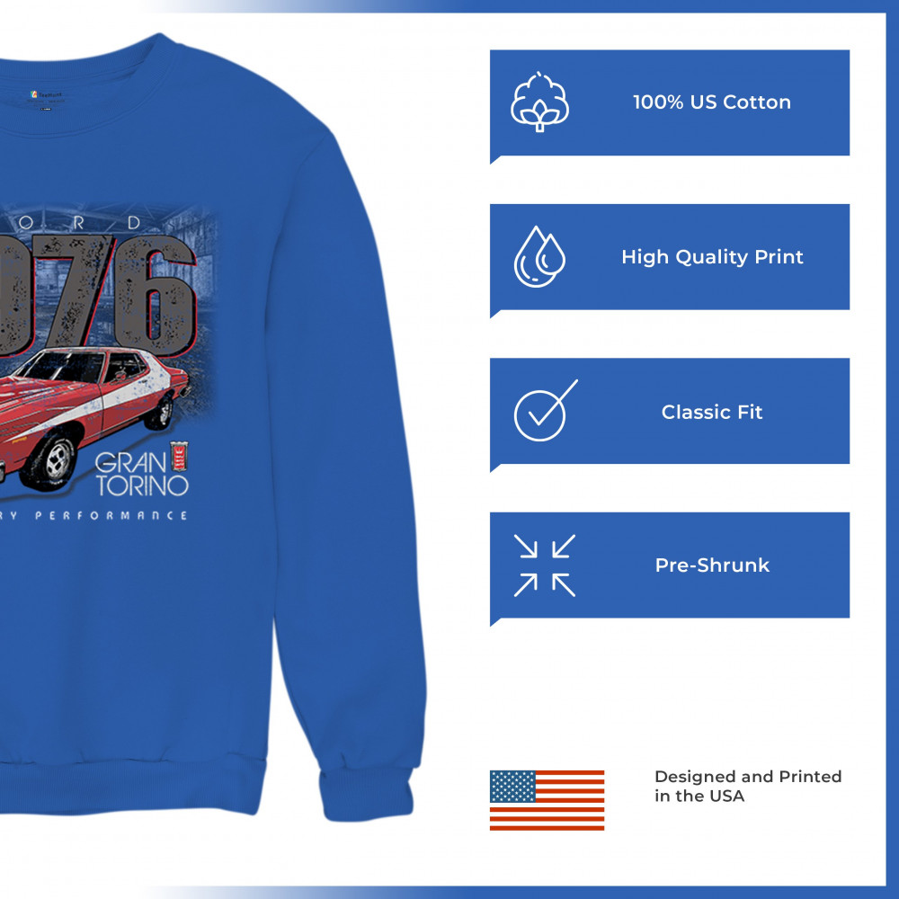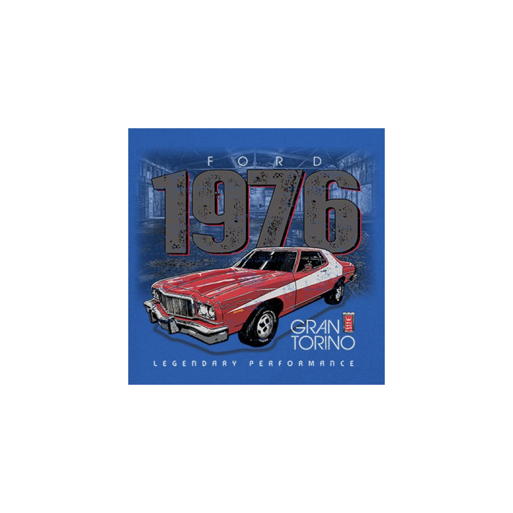 1976 Ford Gran Torino design with red and white retro style. Perfect for muscle car fans, Ford lovers, and classic car event gear.