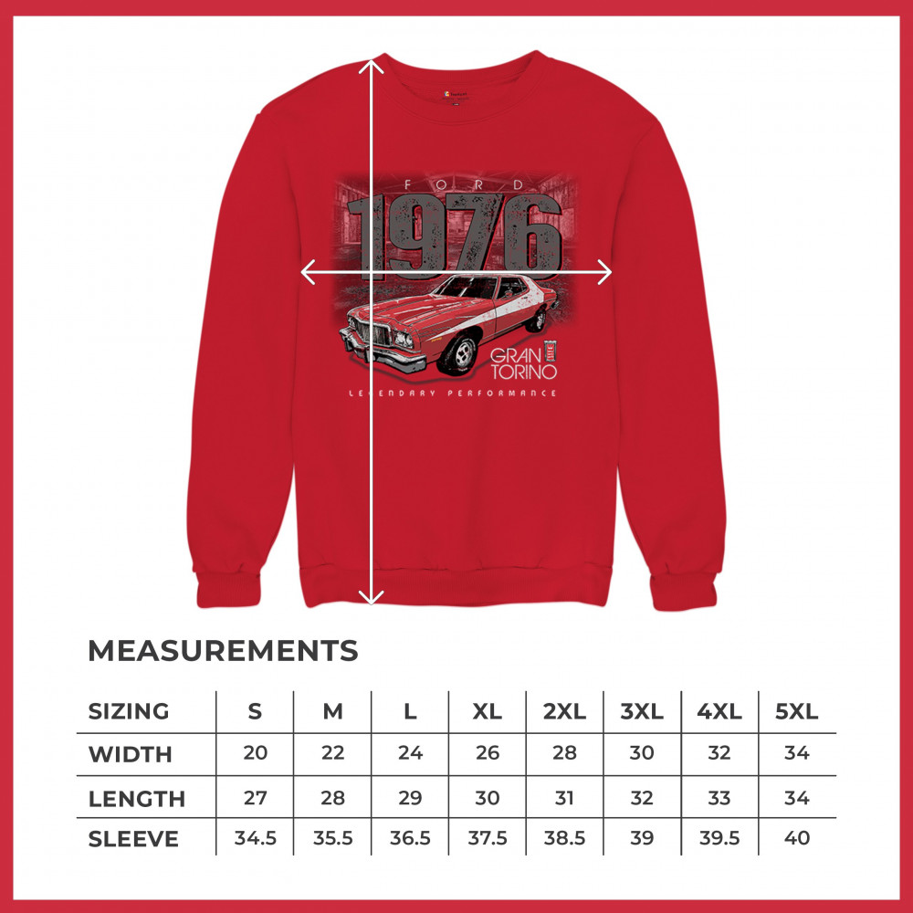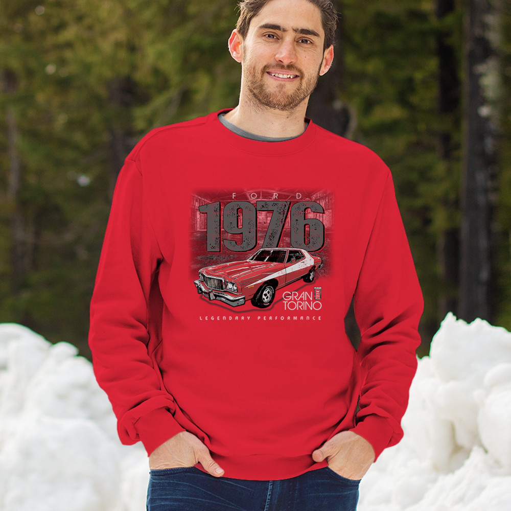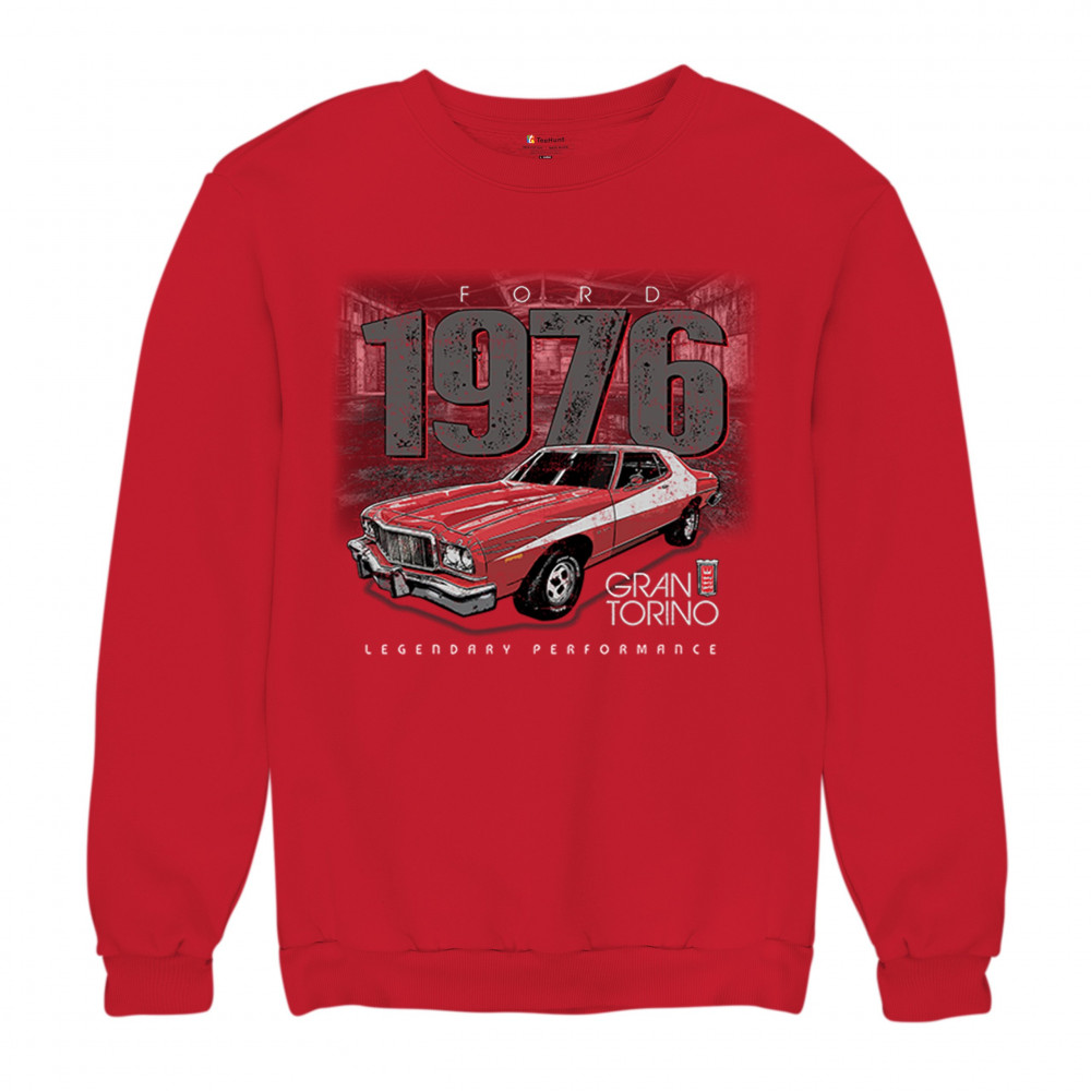 1976 Ford Gran Torino design with red and white retro style. Perfect for muscle car fans, Ford lovers, and classic car event gear.