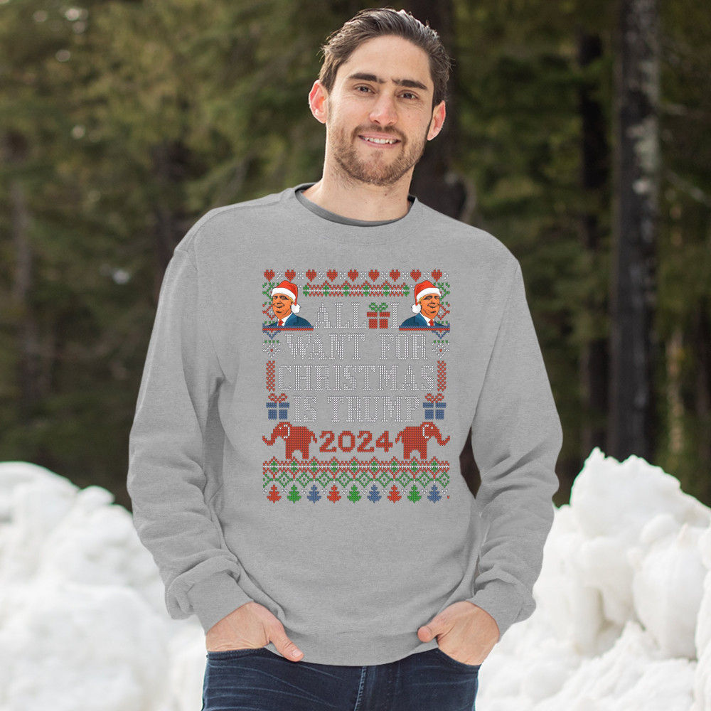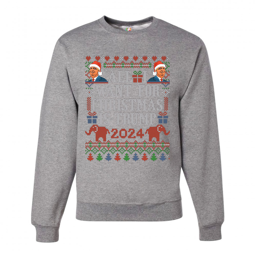 A funny print saying: "All I Want for Christmas Is Trump 2024". The print is decorated as a Christmas ugly sweater and features faces of Donald Trump wearing Christmas hats and two elephants. A great choice to wear for a Christmas or New Year's Eve party