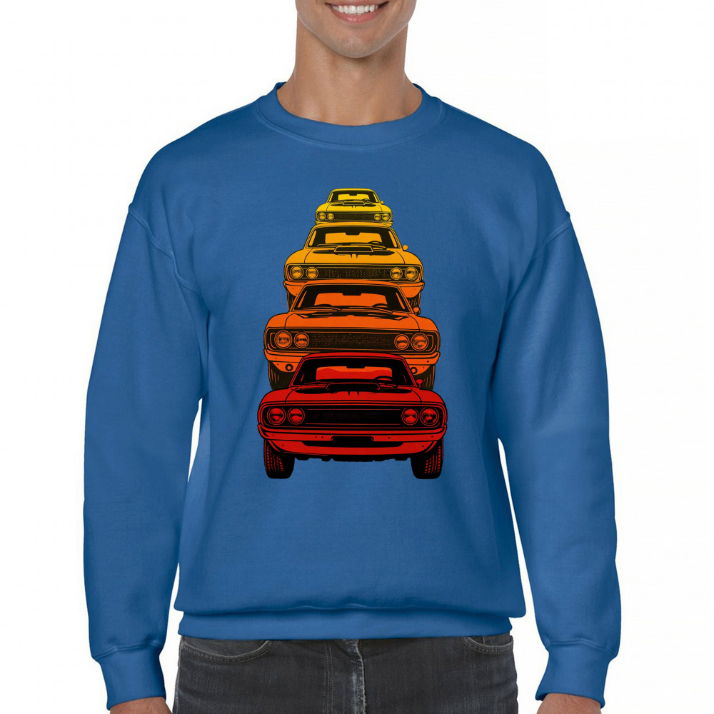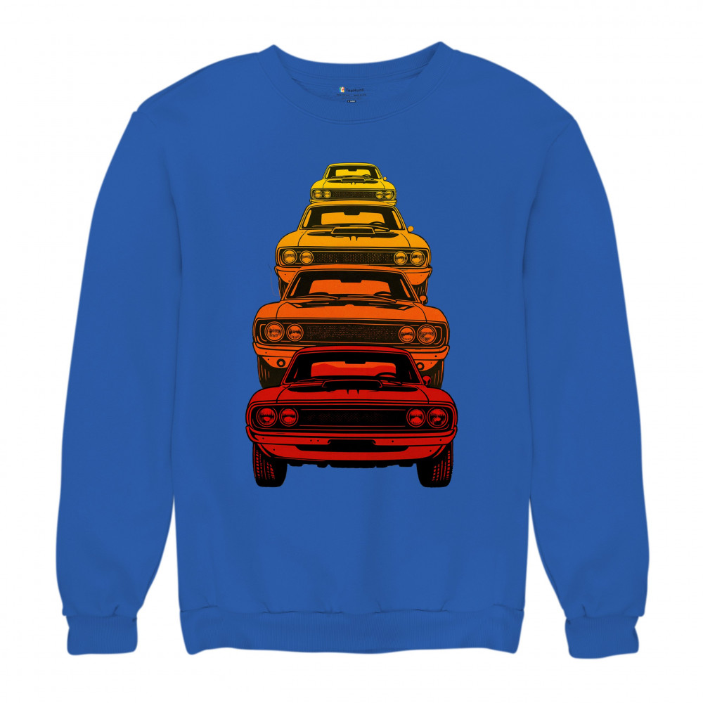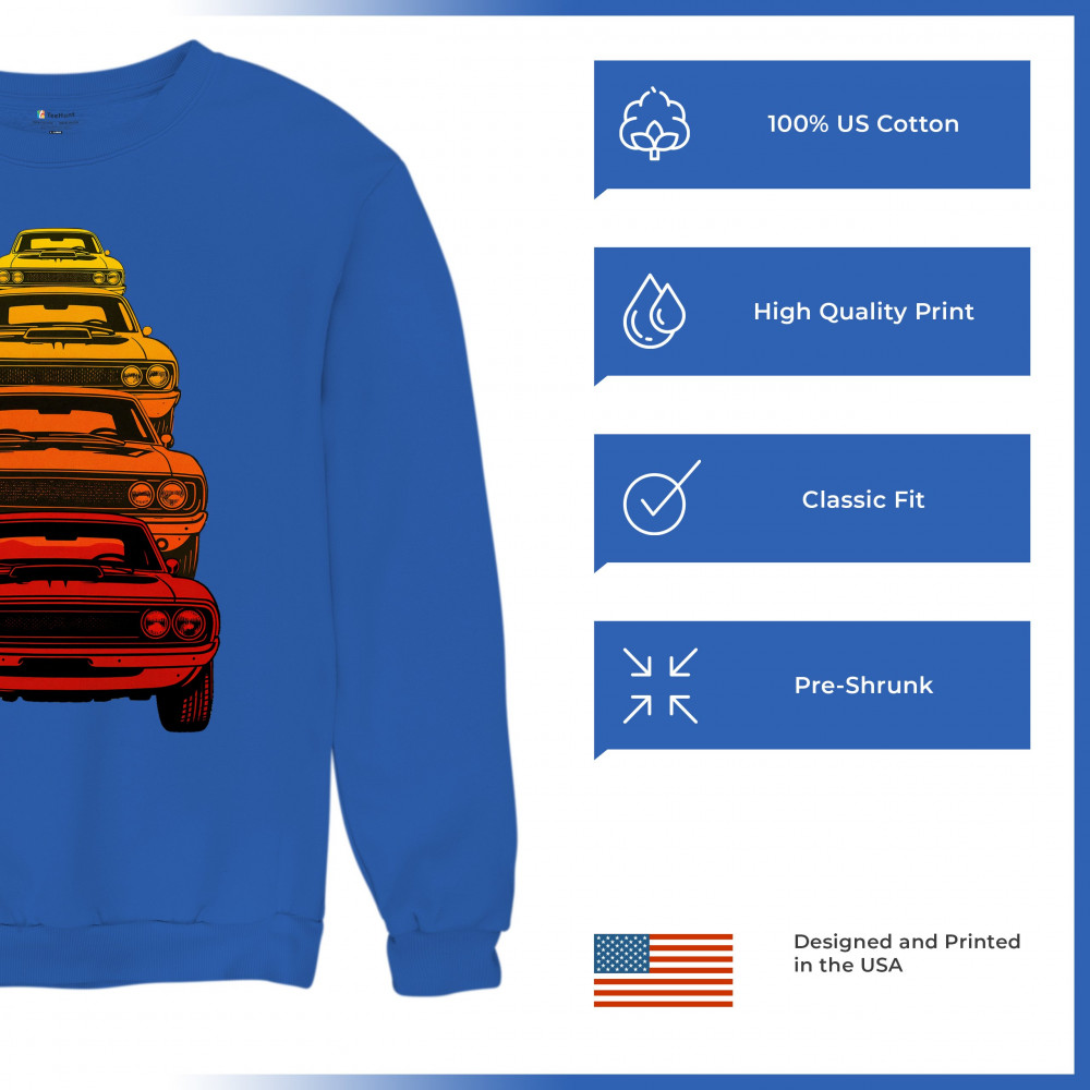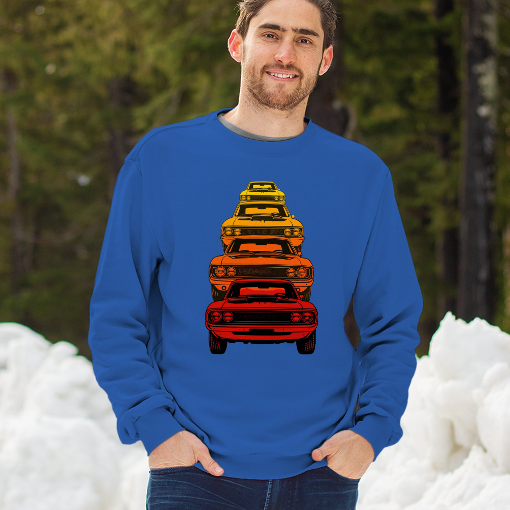 Celebrate horsepower heritage with this colorful lineup of classic muscle cars. Featuring a stacked gradient from red to yellow, this design brings bold retro attitude, V8 pride, and American torque to life. Perfect for collectors, gearheads, and fans of classic car power.