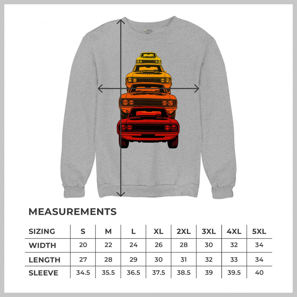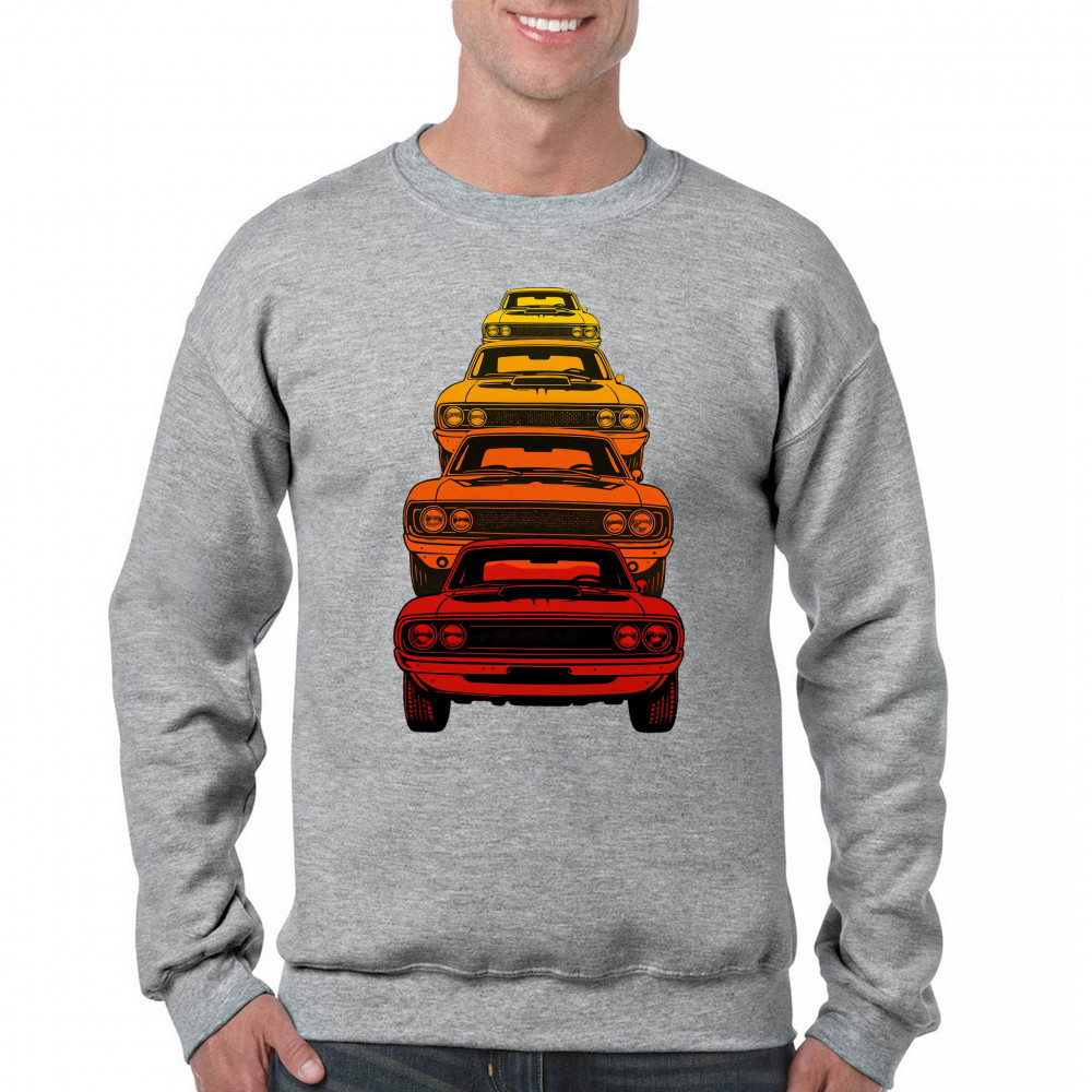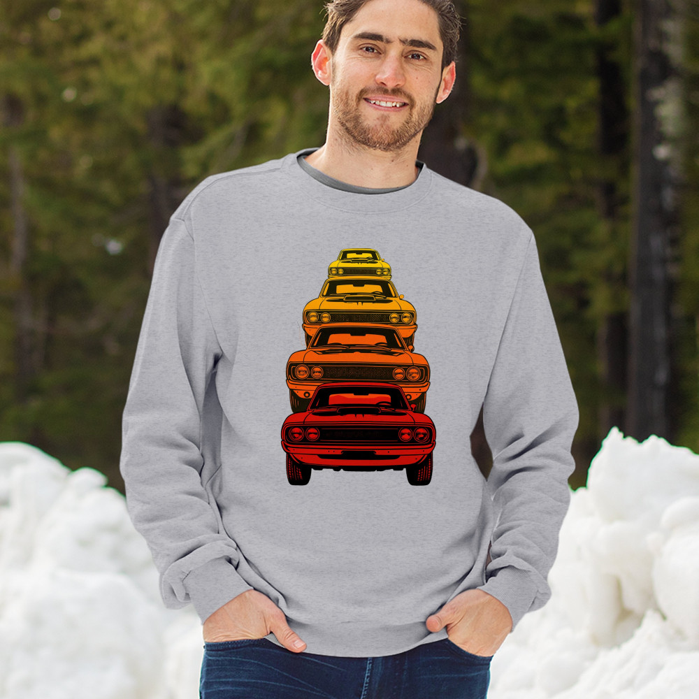Celebrate horsepower heritage with this colorful lineup of classic muscle cars. Featuring a stacked gradient from red to yellow, this design brings bold retro attitude, V8 pride, and American torque to life. Perfect for collectors, gearheads, and fans of classic car power.
