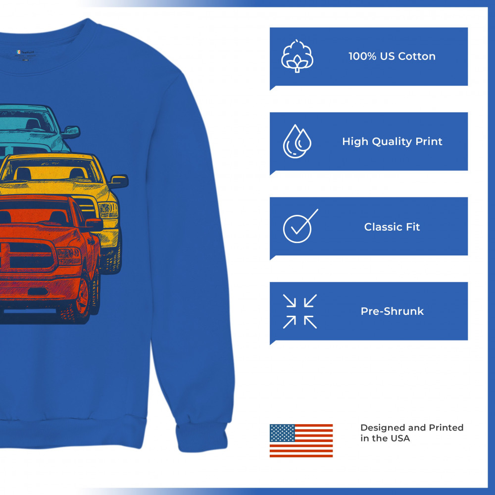 Bold stacked pickup truck design in red yellow blue. Great for lifted truck fans, gearheads, off-road events, and diesel-powered pride.