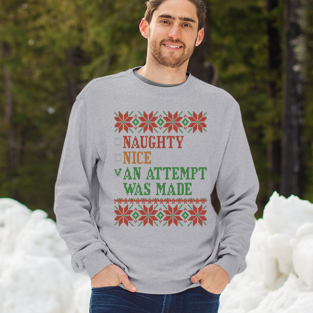 A funny print featuring a check list with options: "Naughty", "Nice" and a checked one "An Attempt Was Made". The print is decorated as an ugly sweater. Amazing choice to make people smile and spread positive vibes on Christmas Eve.