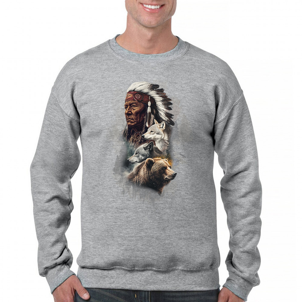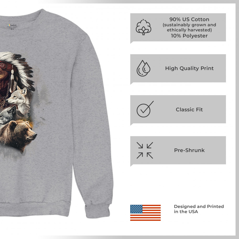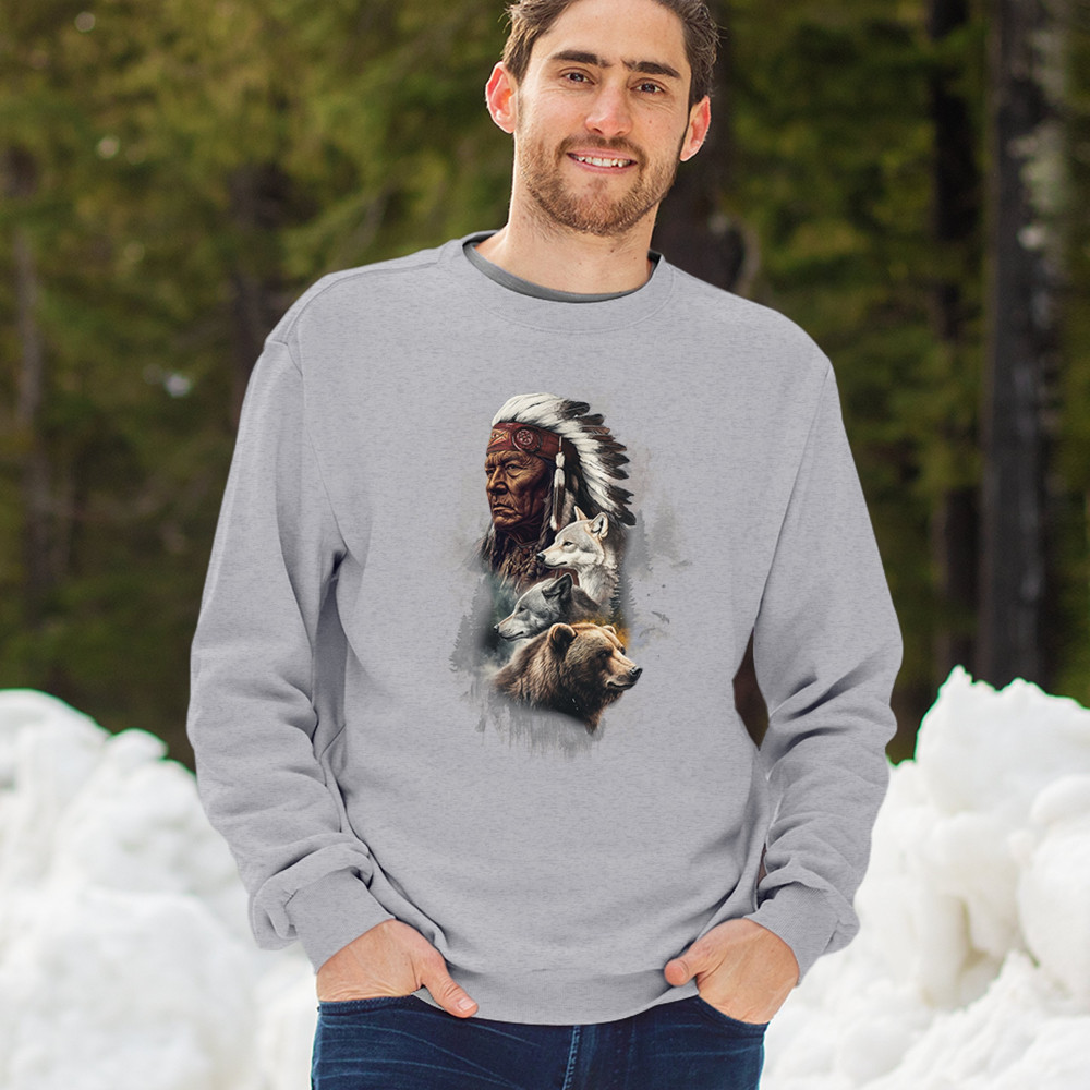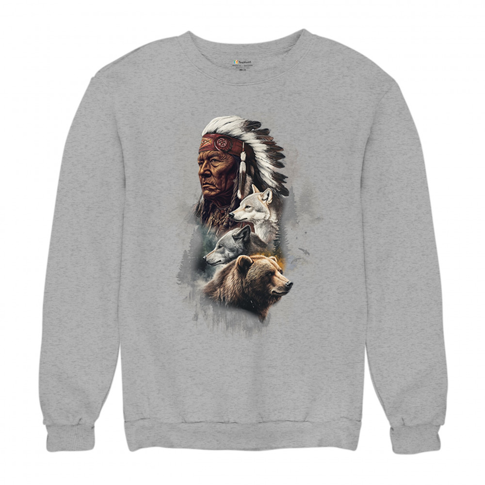 Celebrate spiritual strength and heritage with this design featuring a Native American elder alongside wolves and a bear. This tribal and totemic art reflects wisdom, guardianship, and deep forest spirit energy. Perfect for cultural pride, animal lovers, and those connected to spiritual symbolism in nature.