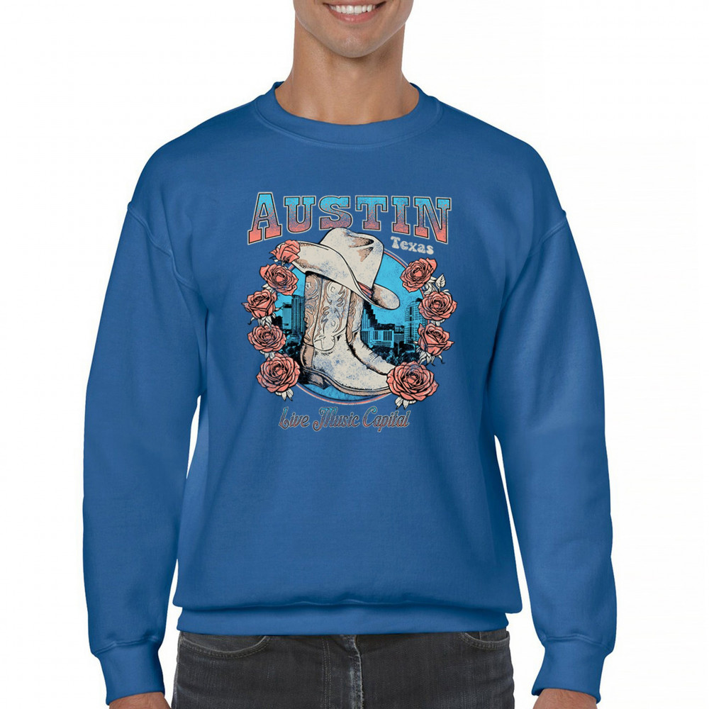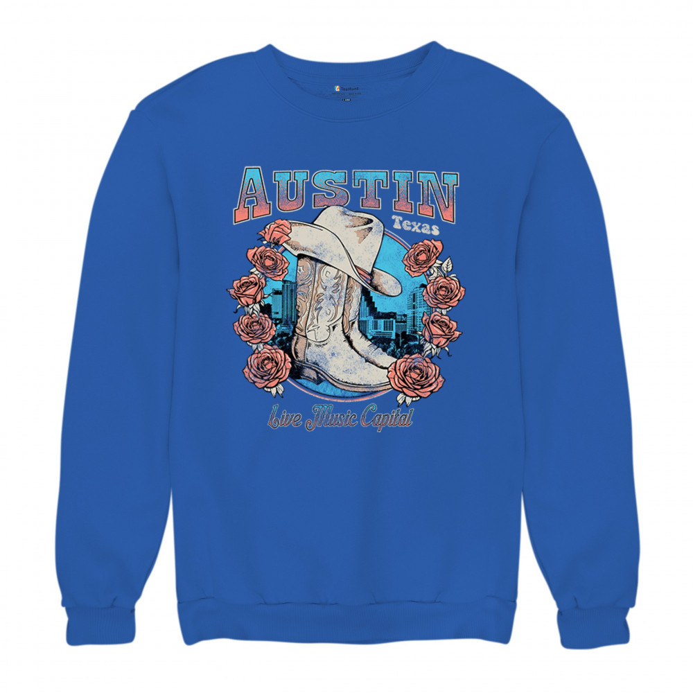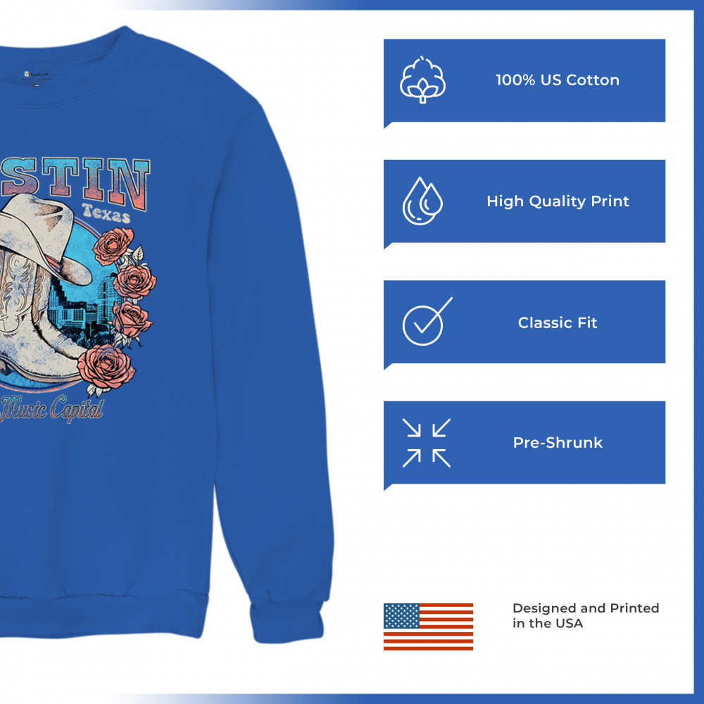 Austin TX Live Music Capital comes alive in this vintage cowgirl boots and hat design, accented by roses and the city skyline. Perfect for lovers of country music, honkytonk vibes, and western chic, this design embodies southern spirit, rustic grit, and the proud Americana aesthetic of Texas’ iconic music scene.