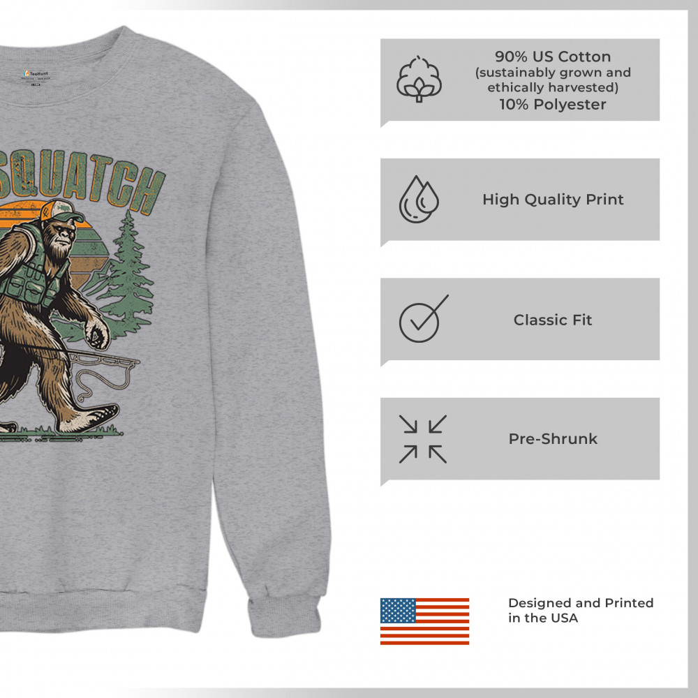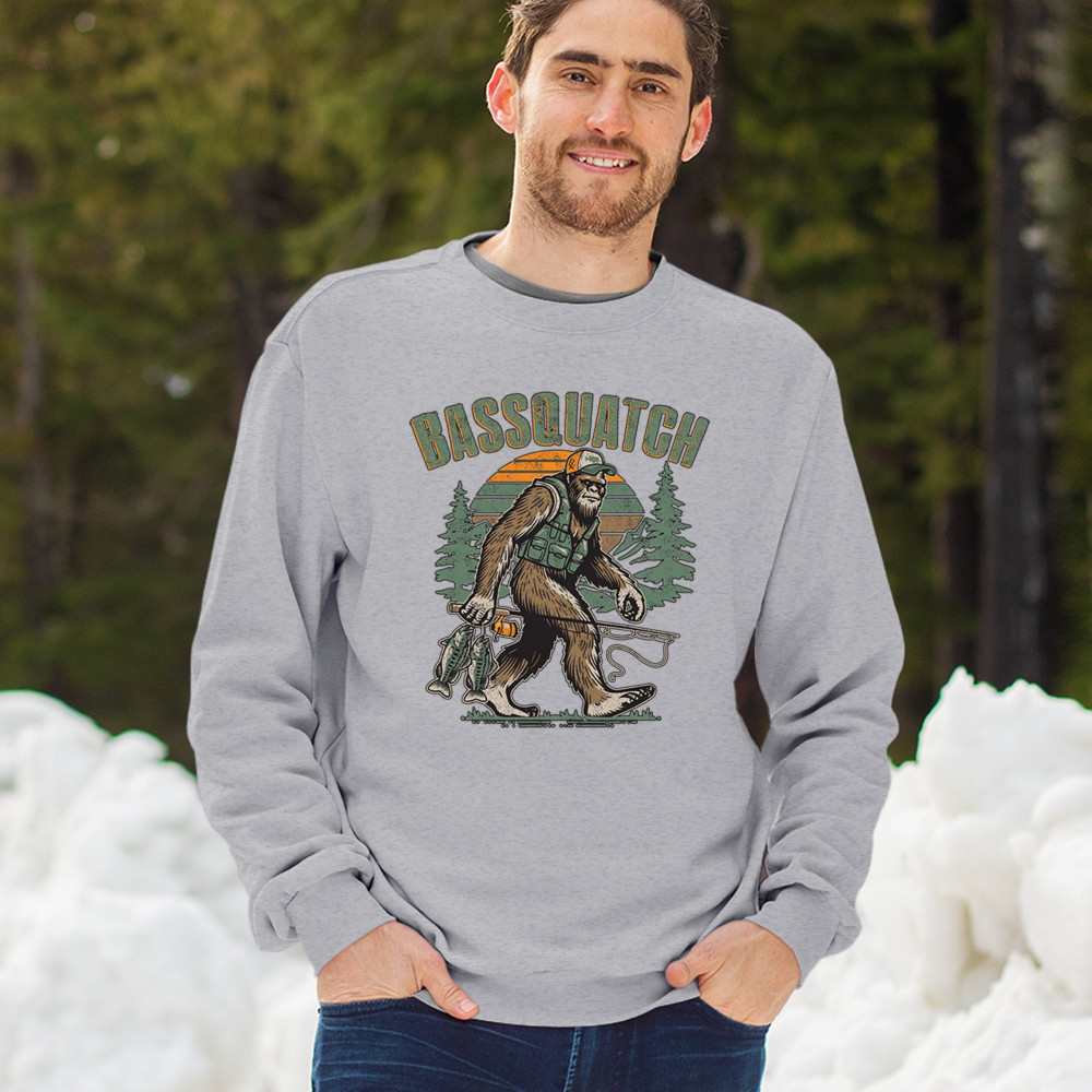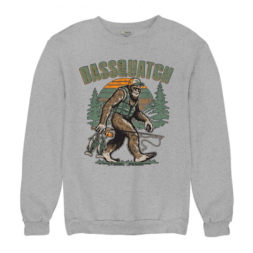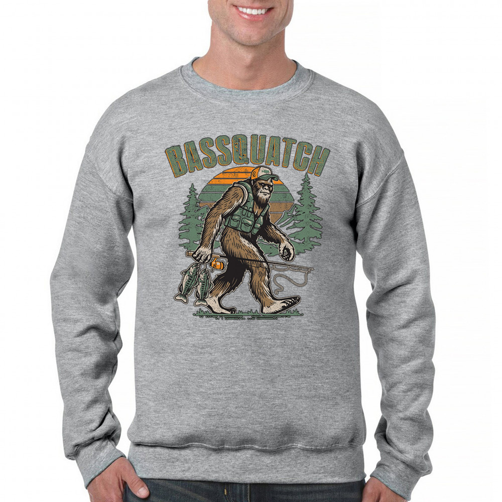 Funny Bassquatch design blends Bigfoot, fishing humor, and retro forest style. Great for anglers, cryptid lovers, and outdoorsy pun fans.