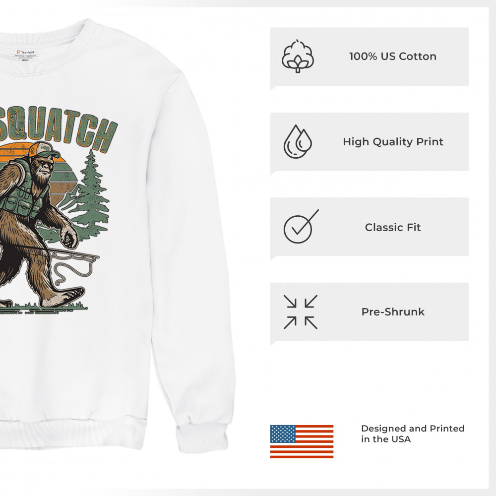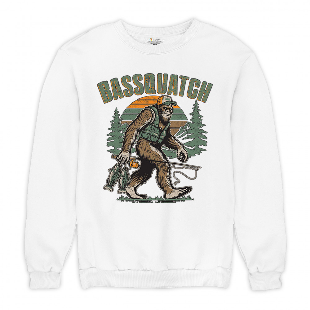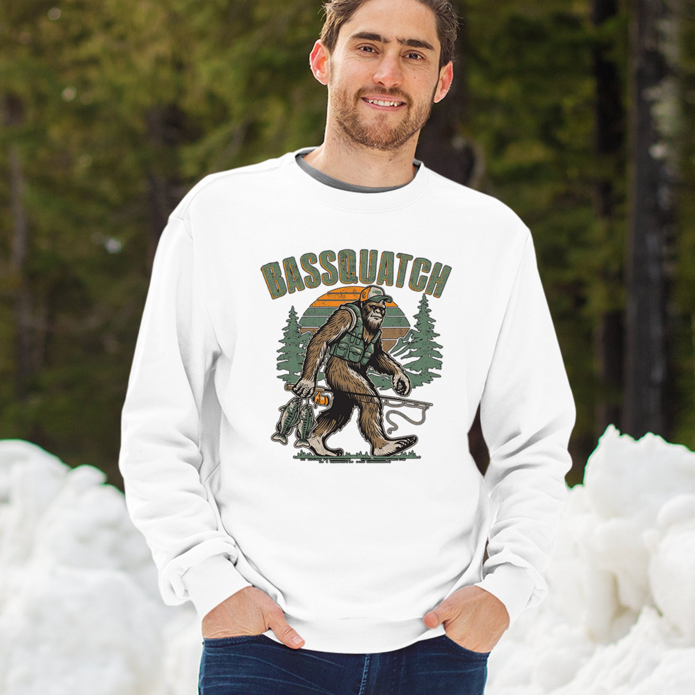 Funny Bassquatch design blends Bigfoot, fishing humor, and retro forest style. Great for anglers, cryptid lovers, and outdoorsy pun fans.