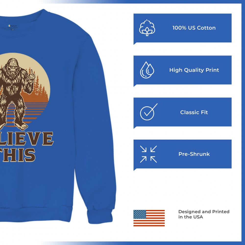 The Believe This Bigfoot design blends cryptid folklore with blunt attitude—because sometimes you just don’t care who believes. Featuring Bigfoot flipping the bird against a rustic tree line, it’s perfect for campers, rebels, and fans of sarcastic forest humor. Ideal for hikes, festivals, and off-grid living.