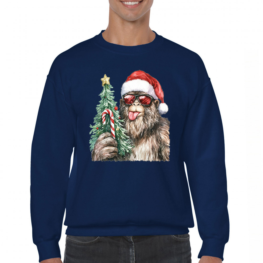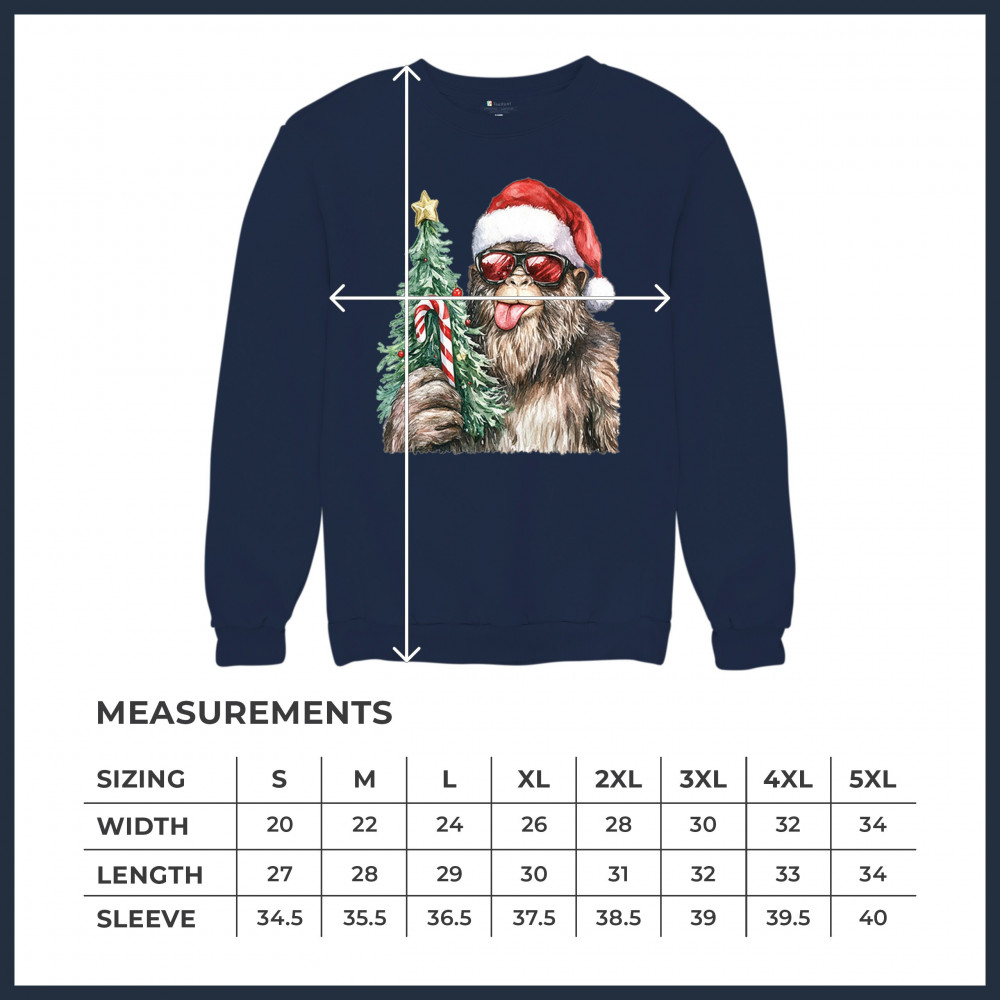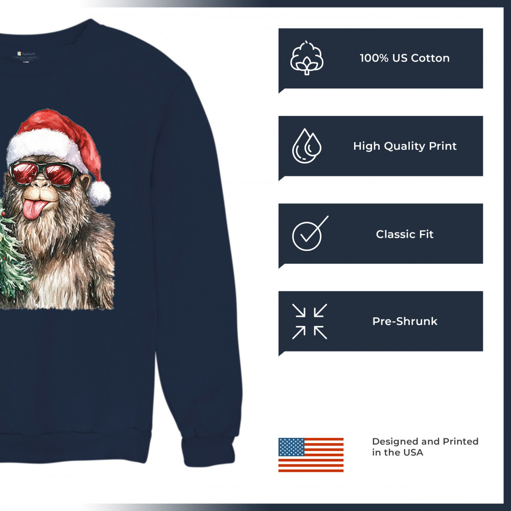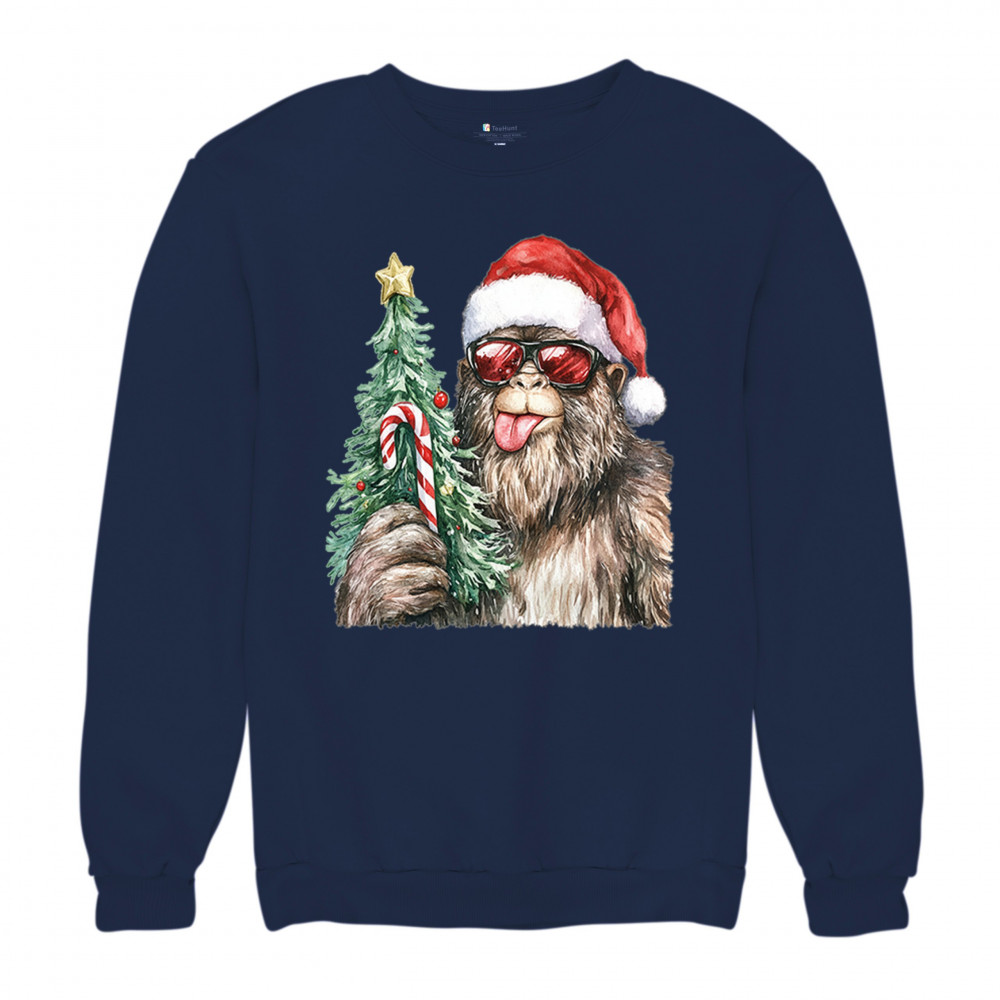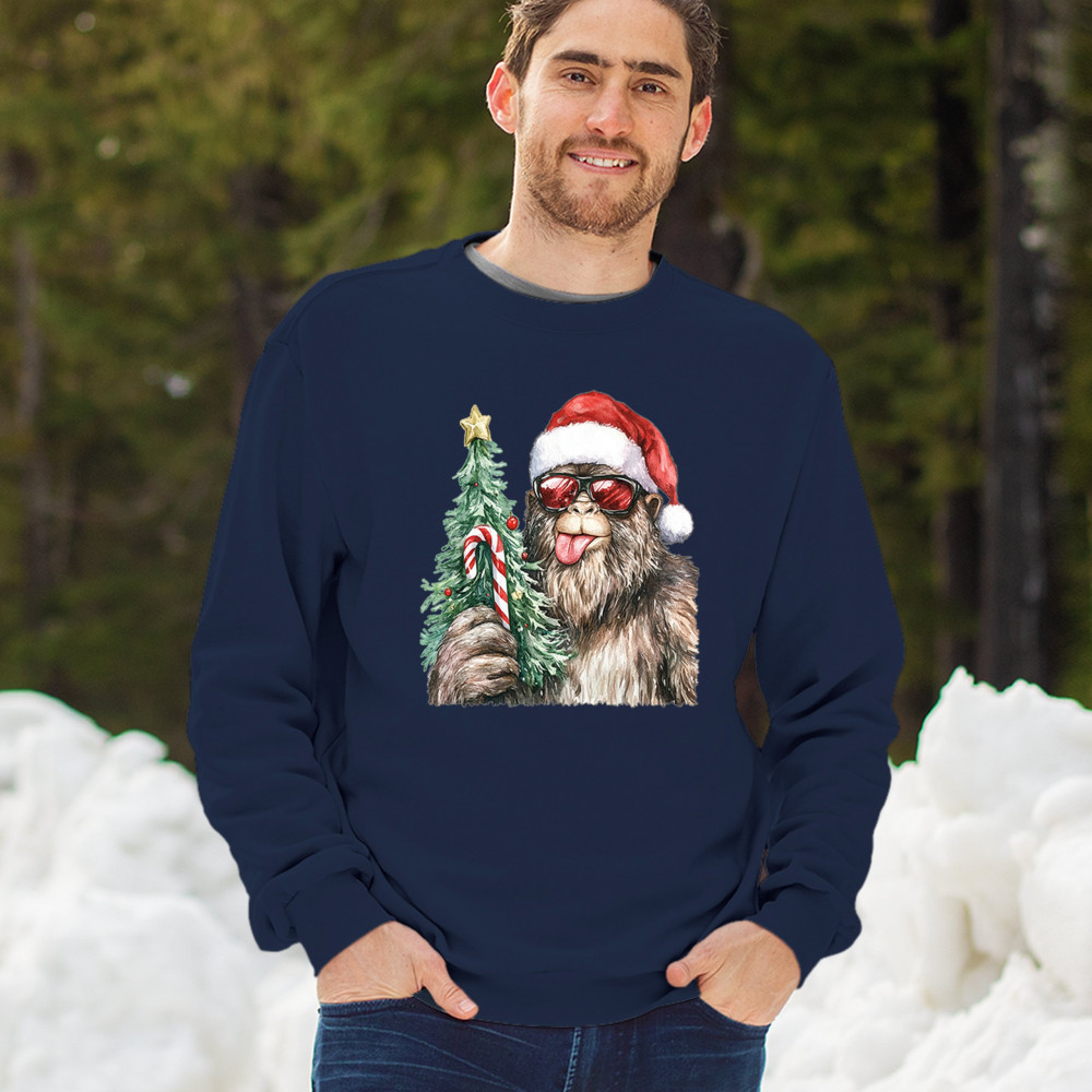 Bigfoot Christmas Santa shirt – festive Sasquatch holiday humor tee with Santa hat design, Xmas tree, candy cane, and funny Christmas style.